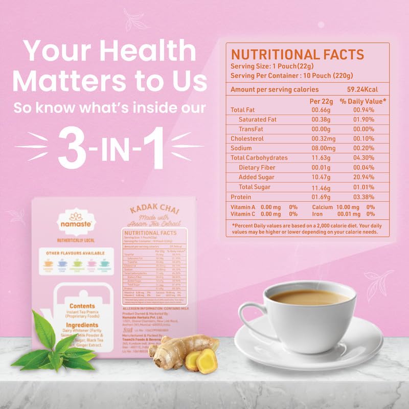 Namaste Chai Instant Tea Premix Kadak Chai | Assam | Ginger Clove Cinnamon Nutmeg & Cardamom | Milk and Sugar | Ready Mix Powder | 22g x 10 Sachets