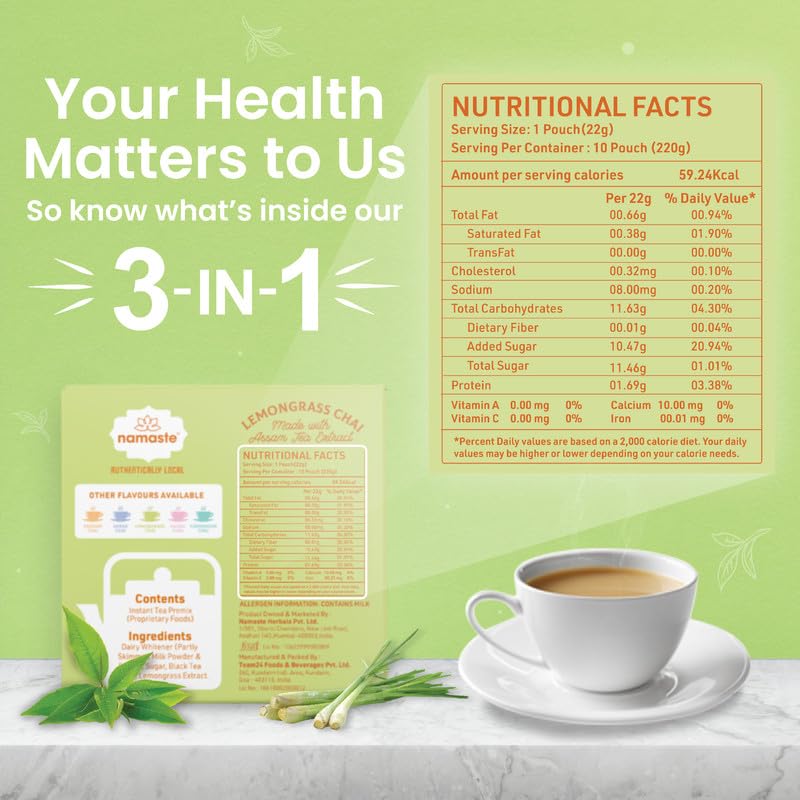 Namaste Chai Instant Tea Premix Lemongrass Flavour | Assam | Milk and Sugar | Ready Mix Powder | 22g x 40 Sachets | Pack of 4