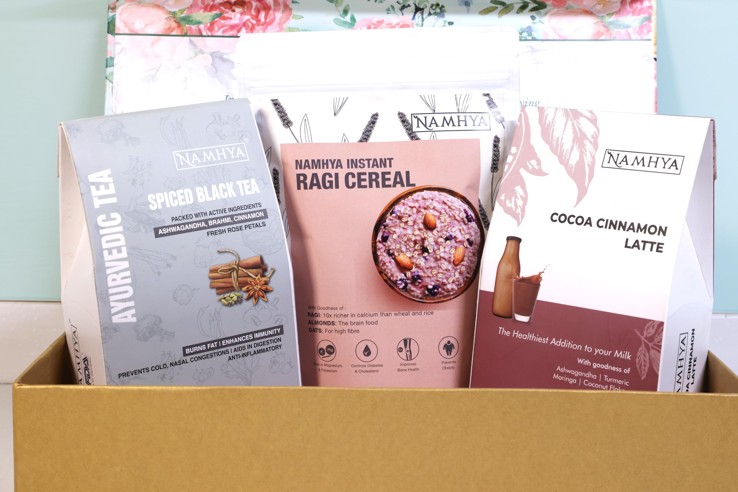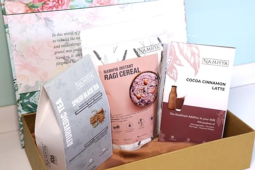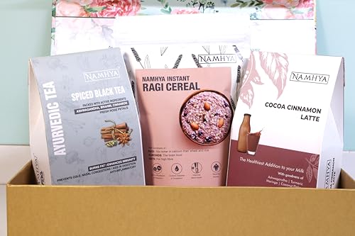 • Light up with wellness- This best festive hamper includes Namhya Ragi Instant Breakfast Cereal 300g x 1 Namhya Cocoa Cinnamon Latte 100g x 1 Namhya's Spiced Ayurvedic Tea 150g x 1 Premium Gift Box x 1
