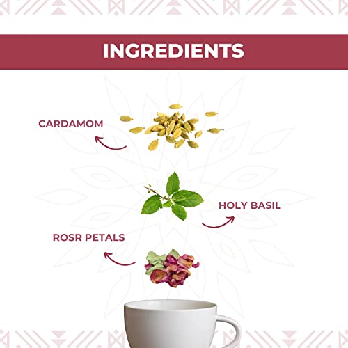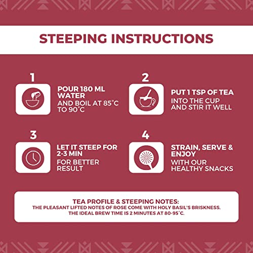 A perfect mood booster! Made with enchanting Rose petals Holy basil and a touch of cardamom. Rose petals have a uplifting flavour and coupled with fresh green tea and tulsi the tea is truly a mood booster Tea benefits: The tea is Calming a Mood Booster & Helps with Immunity and Cleansing. Tea profile & steeping notes: The pleasant lifted notes of rose comes with the briskness of green tea. Ideal brew time is 3 minutes at 80-95°c Pack contains: 50 gms loose which will make 25 cups (approx 2 gm per cup).