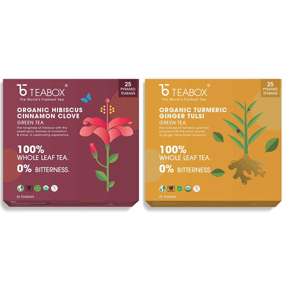 Only Leaf Hibiscus Cinnamon Clove Green Tea 27 Tea Bags (25 Tea Bags + 2 FREE Exotic Samples)This unique mix of hibiscus and cinnamon green tea will definitely make a mark on your tastebuds. This tea brings to the table tarty notes from hibiscus and a strong full flavor from the cinnamon which will definitely be a favourite with those with strong palattes. A great favourful addition to your weight management routine. Have a cup a day to keep you in great shape.Only Leaf Turmeric Ginger Tulsi Green Tea 27 Tea Bags (25 Tea Bags + 2 Free Exotic Samples)A coming together of rich ingredients this tea is a flavorful cup with the richness of turmeric ginger and basil. With rich ingredients that are well known for their medicinal qualities this tea definitely strengthens you with every cup.