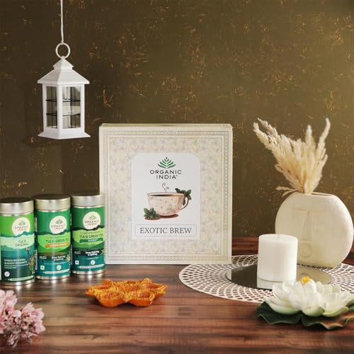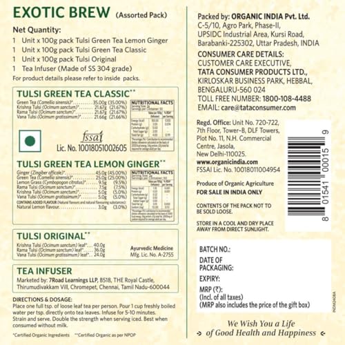 A TATA Product - Organic India Exotic Brew Tea Gift Box (3 Loose Tea Assorted tin pack, 100g each with Tea-Infuser) | Blend of Rama, Krishna & Vana Tulsi | Certified Organic