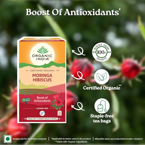 A TATA Product - Organic India Moringa Hibiscus Infusion, 25 Tea Bags, Certified Organic, Antioxidant-Rich, Caffeine-Free, Whole Herb Blend