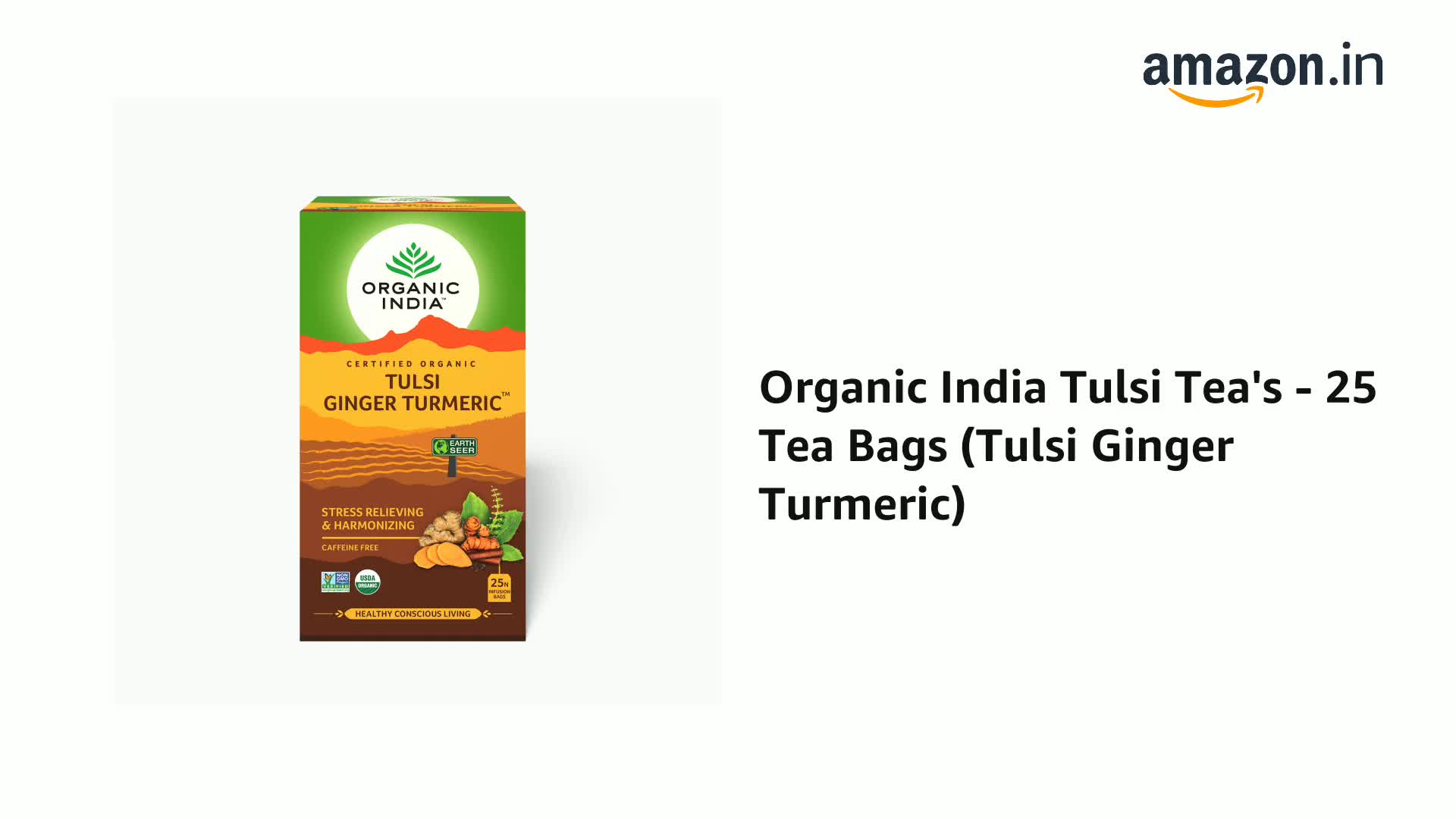 ORGANIC INDIA Tulsi Ginger Turmeric 25 Tea Bags - Stress Relieving & Harmonizing Tulsi Ginger Turmeric - Turmeric's qualities to support the liver & the body's natural inflammatory response while building immunity compliment Tulsi's health enhancing properties beautifully! Blended with ginger & cinnamon it's a delicious drink to savor & enjoy.