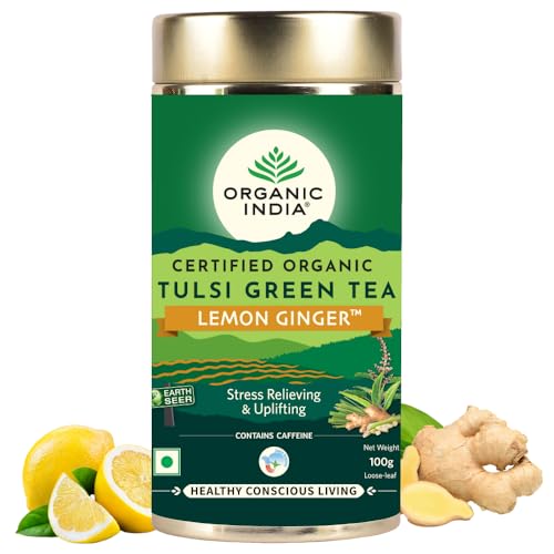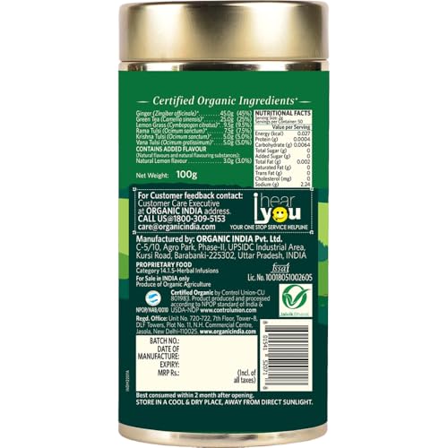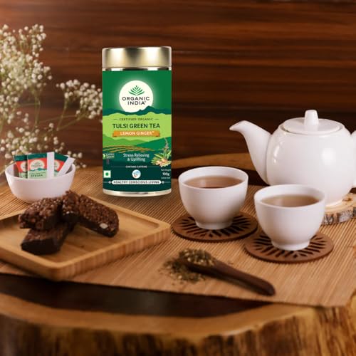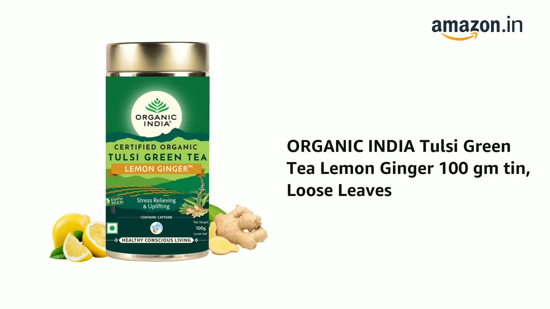 A TATA Product - Organic India Tulsi Green Tea Lemon Ginger - 100g Tin Container, Herbal Blend with Green Tea, Tulsi, Lemon & Ginger, Supports Digestion, Refreshing Taste, Natural Ingredients