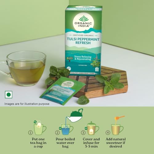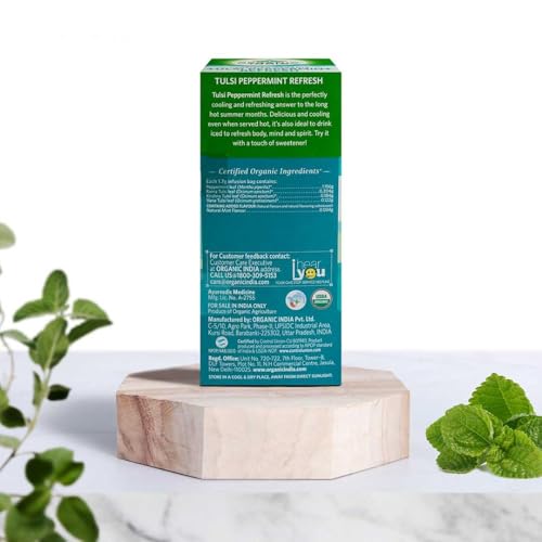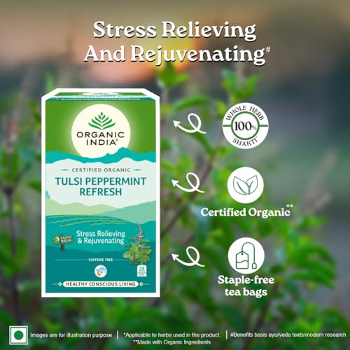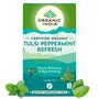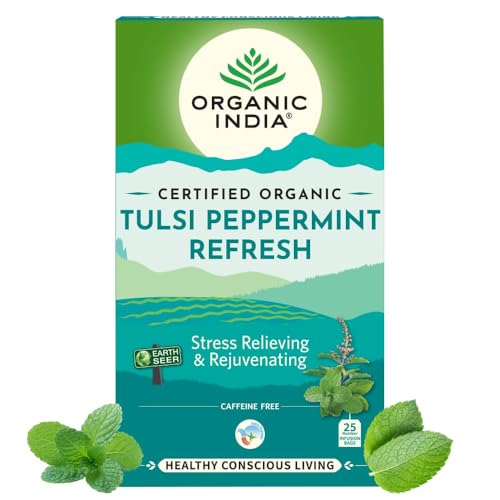 ORGANIC INDIA Tulsi Peppermint Refresh -Stress Relieving & Rejuvenating ORGANIC INDIA's foundational herb adaptogen Tulsi combined with peppermint for a fresh feeling! Tulsi Peppermint Refresh is the perfectly cooling and refreshing answer to the long hot summer months. Delicious and cooling it's also ideal to drink iced to refresh body mind and spirit. Try it with a touch of sweetener! Ingredients include Peppermint leaf Rama Tulsi leaf Krishna Tulsi leaf and Vana Tulsi leaf. Supports optimal digestion.
