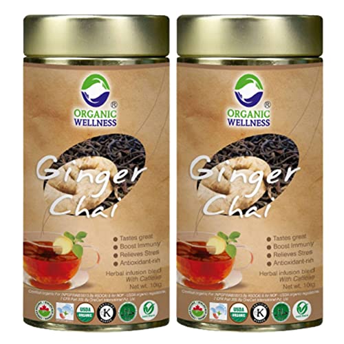 Organic Wellness ginger chai - ginger chai combines the healing properties of black tea with the added boost of ginger traditionally used to activate the body's fire element to burn up toxins and improve digestion. Soothing to the stomach ginger is used to prevent and relieve nausea heartburn and morning sickness. Ginger warms the emotions and sharpens the senses. Ideal for times of cold and flu tulsi ginger is a delicious daily treat.
