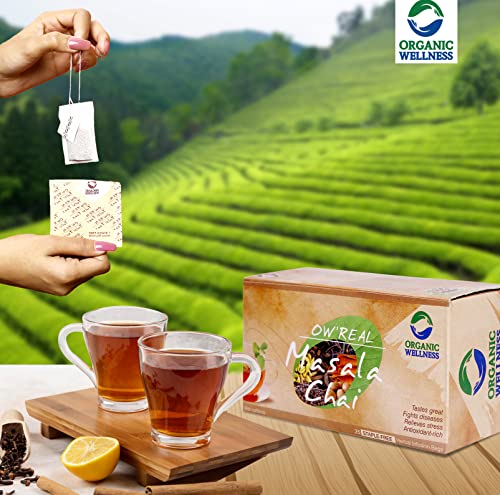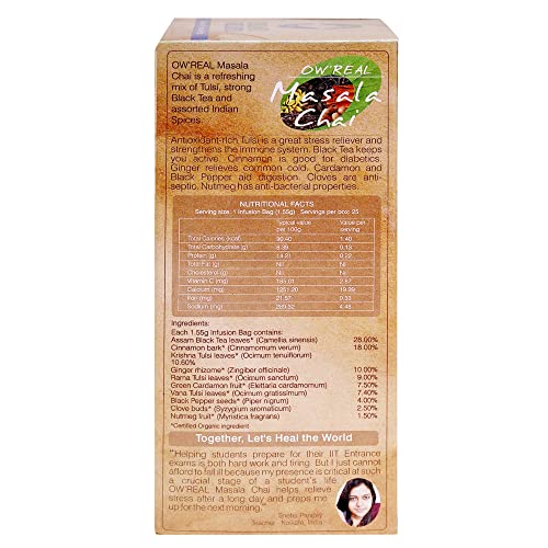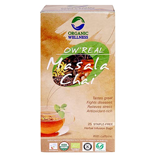 Organic Wellness Real Masala Chai is a refreshing mix of Tulsi Strong Black tea and assorted Indian spices. Antioxidant-rich Tulsi is a great stress buster and to maintain the immune system. Rich in antioxidants it helps in eliminating damaging free radicals from the body. Black tea Keeps you active. Cinnamon is good for diabetics Ginger releives common cold. Cardamom and Black Pepper and Digestion. Cloves are Antiseptic. Nutmeg has anti-bacterial properties.