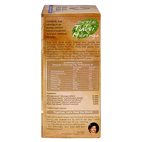 Blend of organic Moringa leaves (50.00%) Lemongrass leaves (25.00%) Krishna Tulsi (10.00%) Vana Tulsi (9.00%) and Ram Tulsi (6.00%)