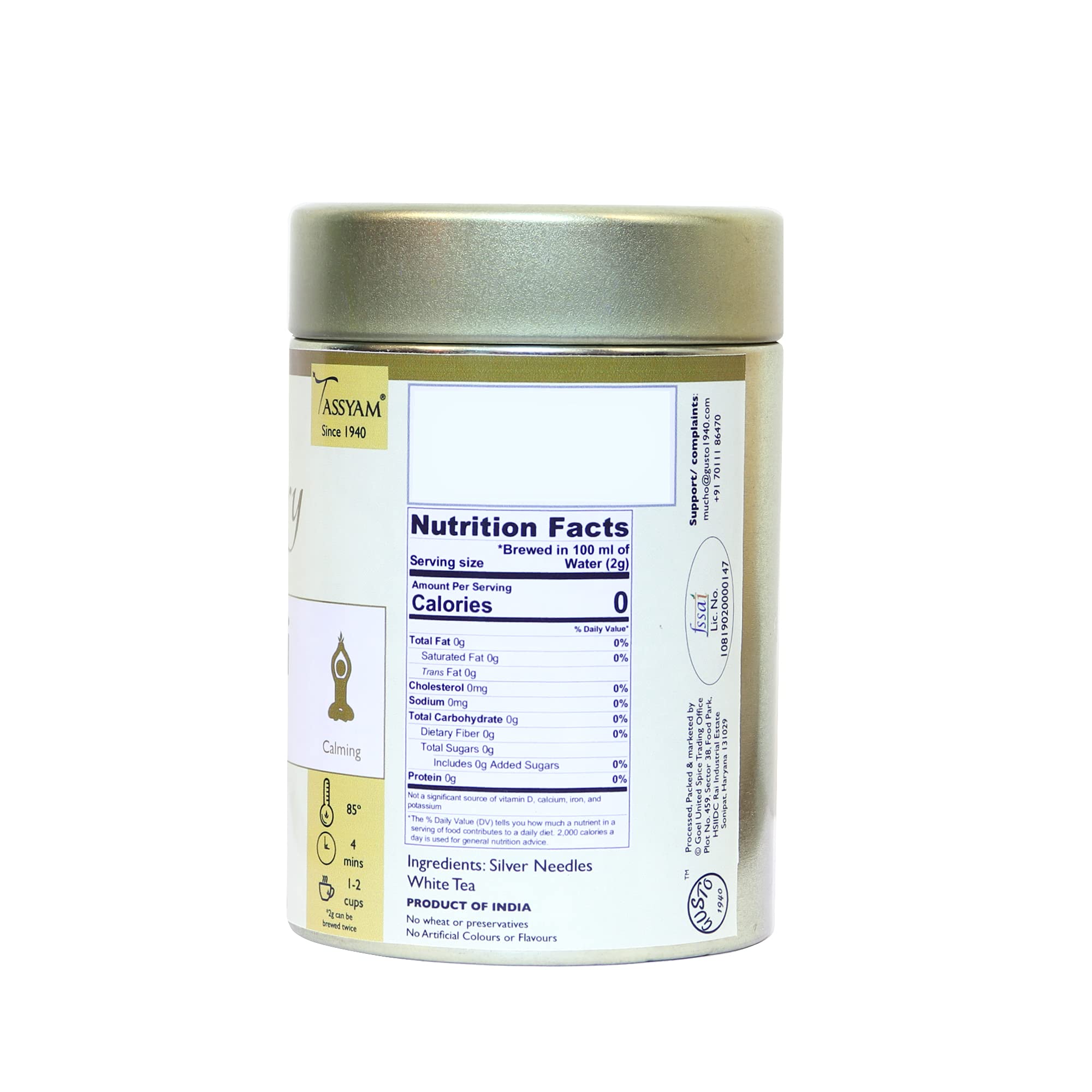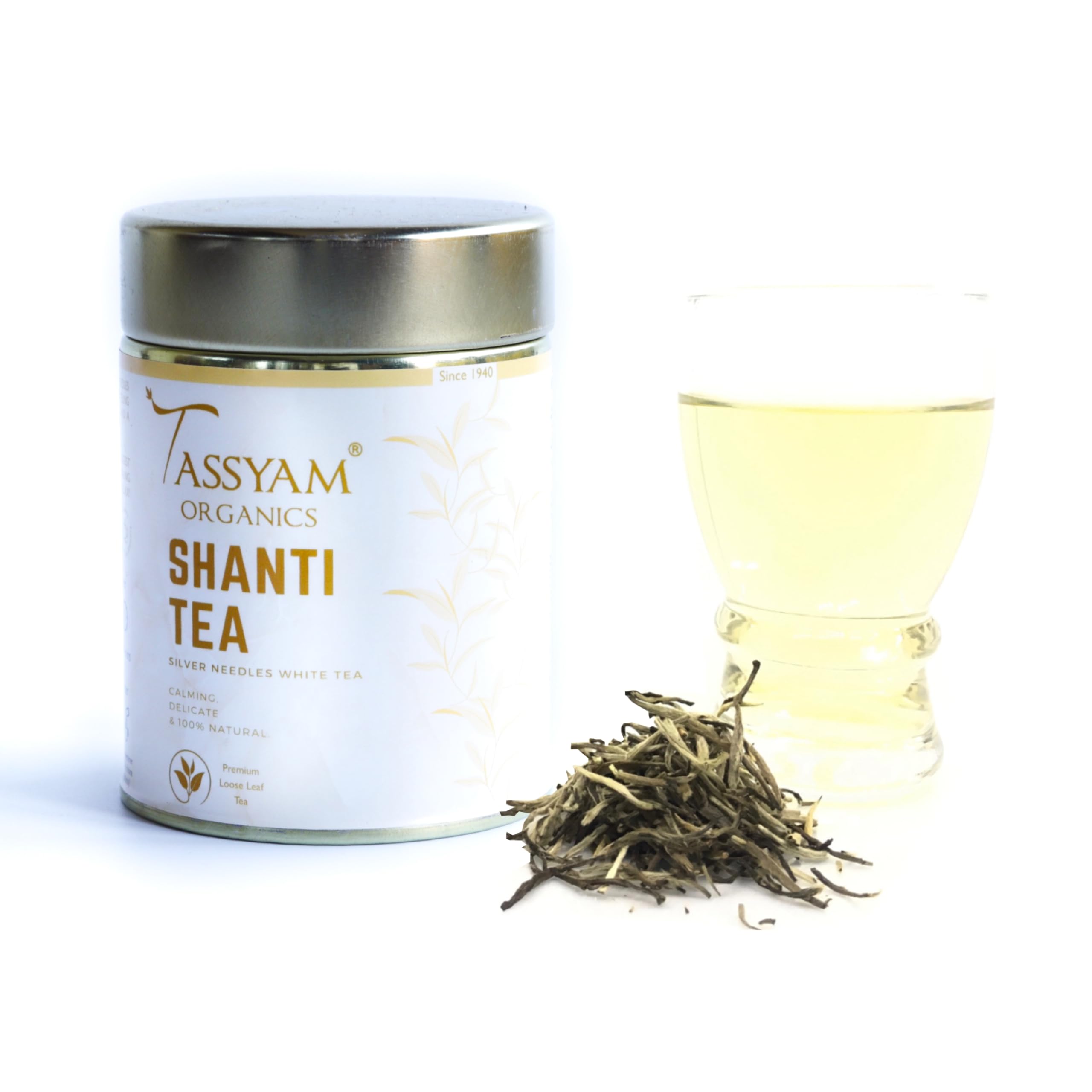 Aptly named as Shanti owing to its calm characteristics Tassyam's white tea is a rare find. The silver down-covered leaves are a unique mix of both glistening white and rusty colours. Brewed this tea acquires a light and almost rose-gold like appearance. With notes of dried apricots and a very smooth aftertaste the tea has a somewhat citrusy-sweet fragrance. To extract the best flavour from this tea add add 2g of the tea to 100-150ml of water (pre-heated to about 85º C) and brew for about 4 minutes. This loose leaf tea can be re-brewed at least twice making a total of about 25 cups. Teas are a seasonal produce and thus flavours keep changing and that's good! Each batch of tea that leaves our facilities is distinct; and this allows you to appreciate the nuances and the subtle differences between each one of them. What we assure is quality; quality in our teas quality in our design and creative philosophy and quality in customer joyfulness (by going a step ahead of customer satisfaction). We steer away for machined produces and make sure that we pour in our hearts while getting your teas hand-picked and hand-blended. The utmost care dedicated to the production and packaging results in impeccable perfection and exclusivity. As we continue our journey to discover this perfection we invite you to share this alluring experience with us.