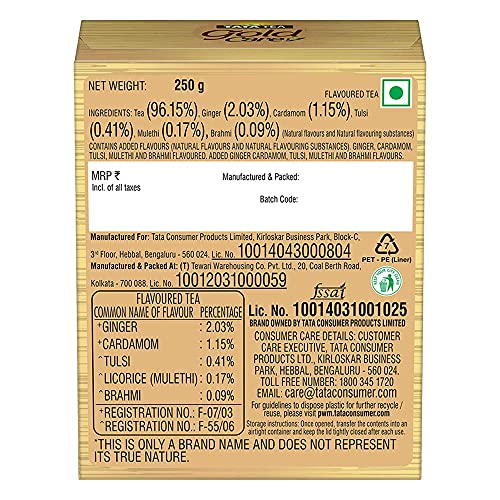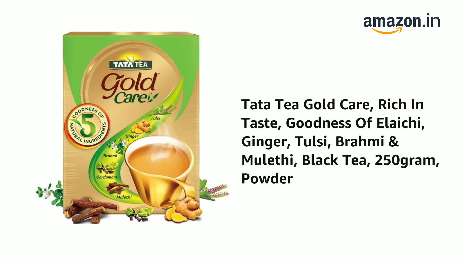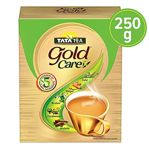 Feel The Care Of Natural Ingredients With Every Sip Of Tata Tea Gold Care Indulge in an exquisite black tea blend of valley-grown tea leaves with five natural ingredients. Feel the care of five natural ingredients (Tulsi Brahmi Cardamom Mulethi & Ginger) each with its unique benefits in a cup of Tata Tea Gold Care. This flavoured tea contains Ginger which is known to be helpful for common colds and coughs. Whether you want to relax after a long day or energise yourself in the morning Tata Tea Gold Care is the perfect choice.