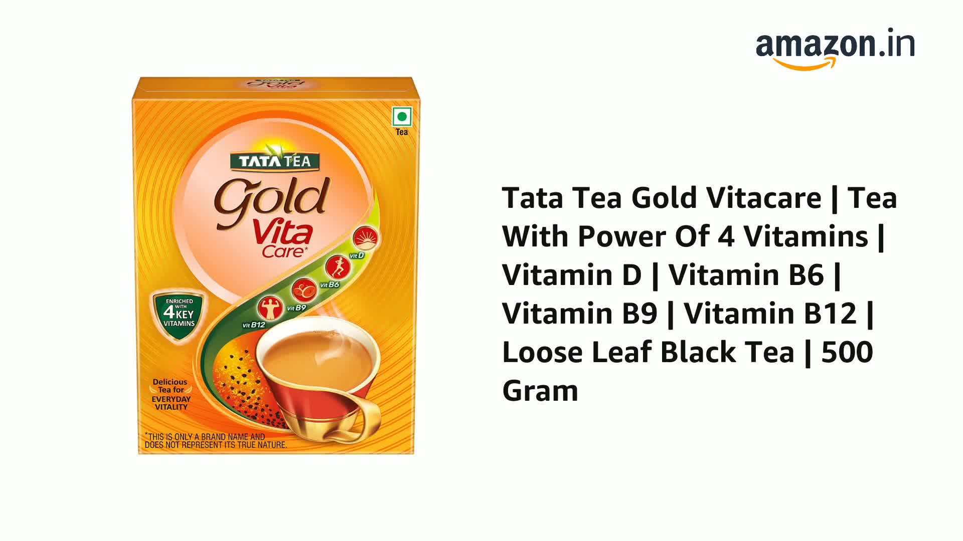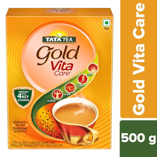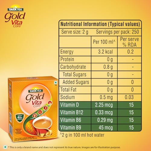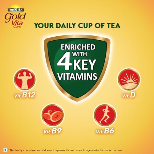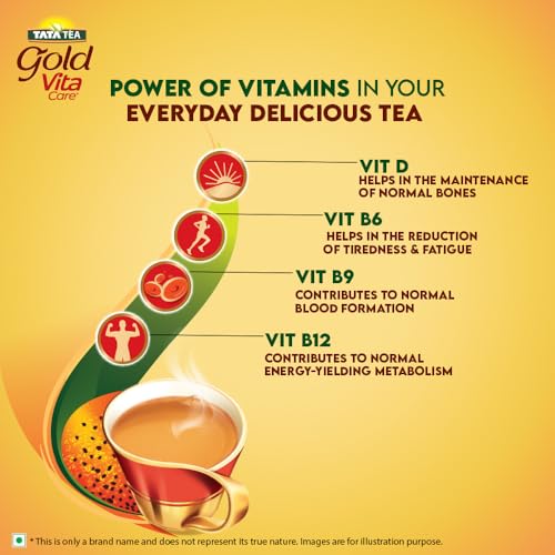 Enriched with 4 Key Vitamins! Start your day right with the goodness of vitamins in a delicious cup of Tata Tea Gold VitaCare. Tata Tea Gold VitaCare is a unique blend of tea with the comforting warmth of traditional tea with the power of vitamins. Enriched with 4 key vitamins: Vitamin D Vitamin B6 Vitamin B9 & Vitamin B12. 2 serves of this tea provide you with 30% of your daily requirement for Vitamins D B6 B9 and B12. Vitamin D helps in the maintenance of normal bones while Vitamin B6 is known to contribute to the reduction of tiredness & fatigue. Vitamin B9 helps in contributing to normal blood formation and Vitamin B12 helps in contributing to normal energy-yielding metabolism. Revel in a cup of this tea with added vitamins to revitalize. Kickstart every day with a rich & aromatic cup of this tea with the power of vitamins. Incorporate essential vitamins into your daily routine conveniently with a cup of Tata Tea Gold VitaCare. Tata Tea Gold VitaCare offers a delightful & revitalizing tea-drinking experience.