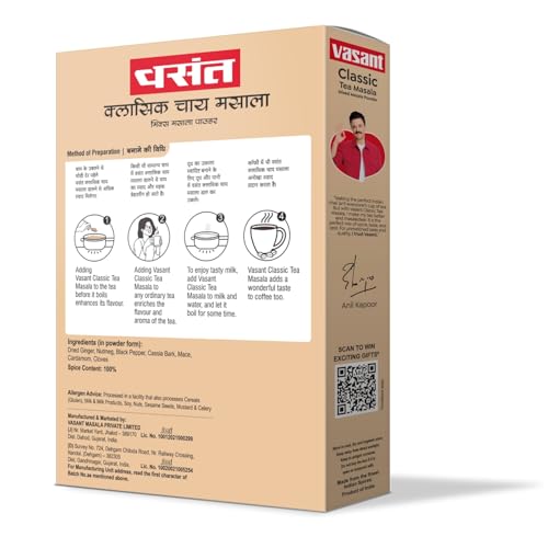 Enhance the aroma and taste of your daily tea with VASANT Tea Masala (Chai Masala) a premium blend of carefully selected spices that add warmth flavor and a refreshing touch to every sip. This all-natural spice mix contains a perfect balance of cardamom ginger cinnamon black pepper clove and nutmeg making your tea more invigorating and delicious.