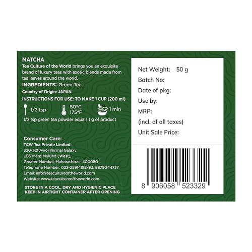 Tea Culture of The World Ceremonial Grade Matcha Tea | Japanese Matcha | Aids In Weight Management | Relaxes Mind | Enhaces Focus | 50 Gram (50 Servings) - Powder