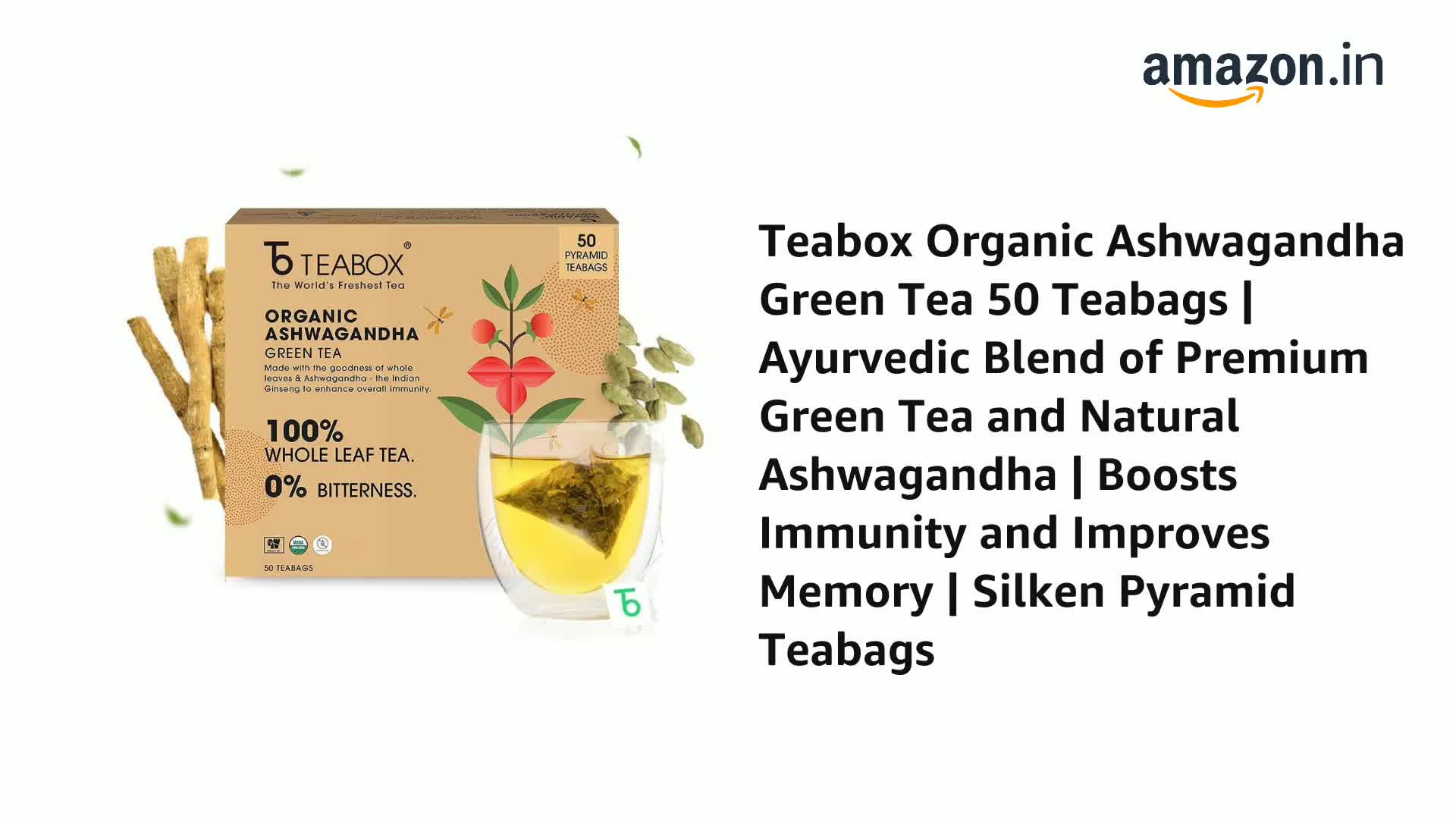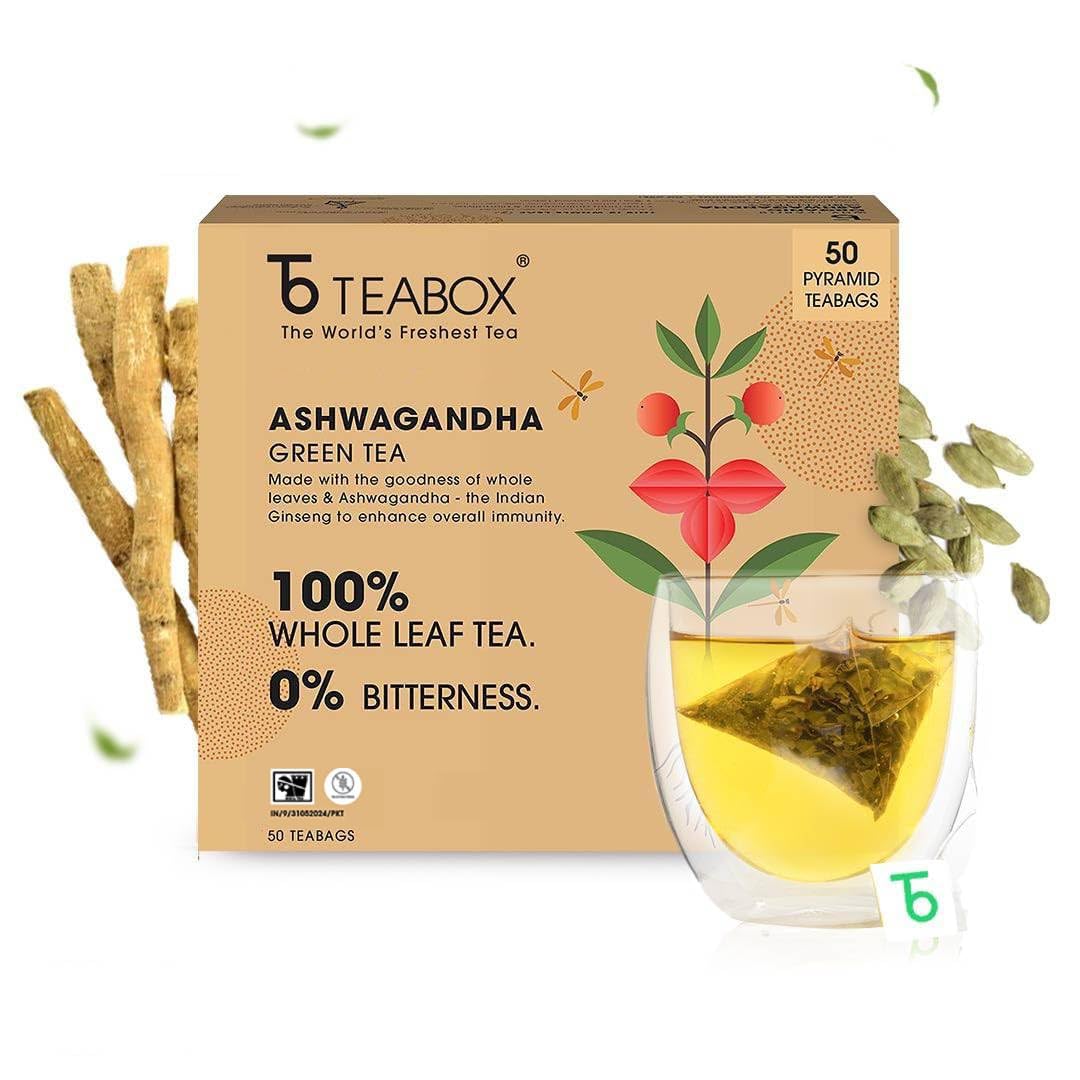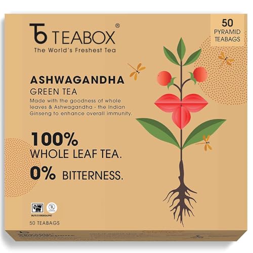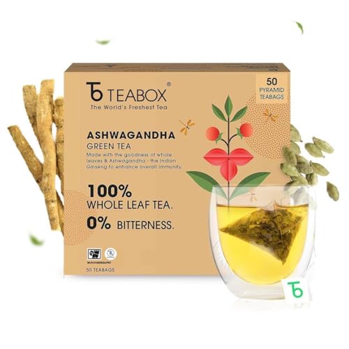 Teabox Ashwagandha Green Tea 50 Teabags | Ayurvedic Blend of Premium Green Tea and Natural Ashwagandha | Silken Pyramid Teabags