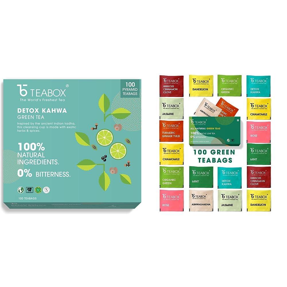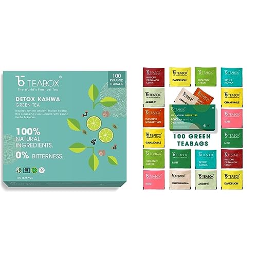 Teabox Detox Kahwa Green Tea 100 Teabags | Made with 8 Natural Ingredients | Helps Cleanse | Immunity Booster | Cold ReliefHEALTH BENEFITS- Pure green tea leaves blended with black pepper salt ginger lemon salt tulsi nutmeg and asafoetida to cleanse and detoxify your systemTeabox Green Tea Sampler Bags 100pcs (10pcs X 10 flavors) | 100% Natural I Immunity Boosting Sampler Pack | USDA Certified Organic Green TeaFrom starting your day to sipping it during the afternoon to evening indulgence to bedtime our master blenders have crafted 10 new exciting and beneficial flavors of whole leaf green teas for a healthy lifestyle. We have sourced rare and exotic Indian herbs to make Ashwagandha Chamomile Dandelion Hibiscus Cinnamon Clove Detox Kahwa Mint Jasmine Organic Green Rose & Turmeric Ginger Tulsi organic green teas. A whole gamut of flavored green teas to start your self-care routine now! Made with 100% Whole leaf. 0% bitterness