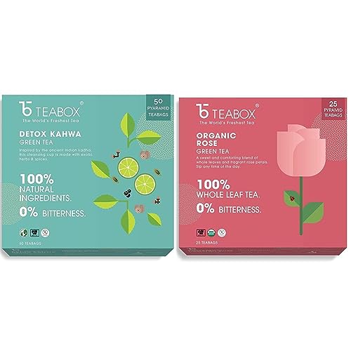 Teabox Detox Kahwa Green Tea 50 Teabags | Made with 8 Natural Ingredients | Helps Cleanse | Immunity Booster | Cold ReliefInspired by the ancient Indian kadha we have sourced these rare and exotic herbs and spices from the dense tropical forests to make a cleansing cup for your everyday well-being. A natural health-boosting cup perfect to sip any time of the day!Teabox Rose Green Tea Bags 25 Pieces | For Glowing Skin | Made with 100% Whole Leaf & Natural Rose PetalsTea plays an important part in our lives as a daily beverage of choice. With growing awareness the appreciation for green tea has increased as a convenient health supplement. Our green teas are made with all-natural ingredients and are all whole leaves that come in pyramid tea bags maximizes the space inside the cup. The pyramid shape allows the ingredients to unfurl and expand. This in turn allows all the flavours to be completely released into your cup. This increases efficiency by enabling the whole leaf to be utilized instead of only the tea particles and the fanning. This rose green tea has a very fragrant character and calms you down instantly. Full of vitamin a and e it helps hydrate and tighten the skin and reduce dark circles. It is also very good for your heart health. Drink it after your long workday to relax you and every day before bed. Now enjoy green teas like never before With high-grade whole leaves that have 5 times more antioxidants than black teas.