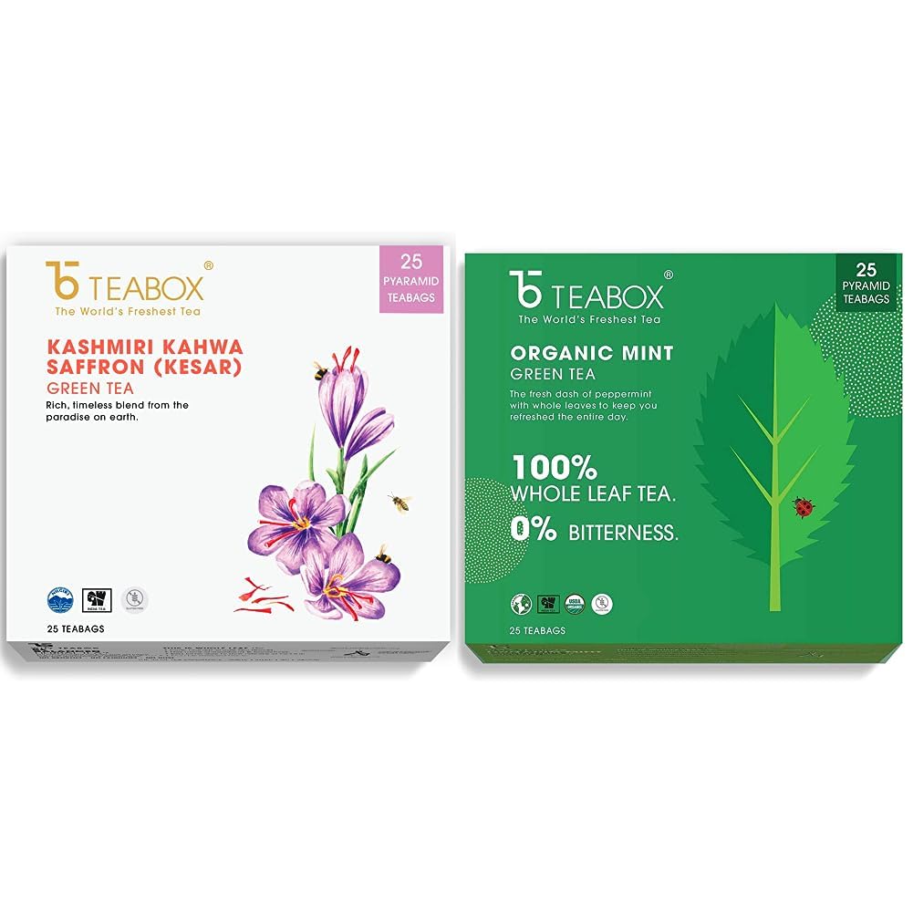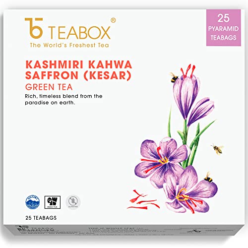 Teabox Fresh Kashmiri Kahwa Saffron (Kesar) Green Tea | Green Tea Handblended with Natural Saffron Almond Cardamom & Cloves | 100% Natural Ingredients 25 TeabagsFlavour: Kashmiri kahwa green tea (teabags) size: 1 box (pack of 16) about the product: experience the world's first natural nitrogen-flushed teabags that seals in the freshness of teas within better than any other. Now you can enjoy the most delicious cup of tea with absolute ease. Our take on a classic brew from the Kashmir valley. Liquor aroma: lifted aroma of saffron and sweet spices liquor taste: the flavors start off savory and woody characteristic of the high-fired green tea. The lento clove note reveals itself next and lingers awhile on the palate. Liquor complements: a refreshing alternative to mimosas at a sunday brunch Teabox: India's modern tea company based out of Darjeeling the heartland of India's tea growing region Teabox is revolutionizing the way India's 200-year old tea industry works. By focusing on preserving the quality and integrity of fine orthodox teas from top tea gardens of India and Nepal Teabox is making sure tea lovers everywhere enjoy the best teas from every harvest at their freshest best. What makes Teabox teas the best. Teabox works directly with over 150 top tea gardens across India and Nepal and procures the freshest teas every harvest season within a week of their production. And with their state-of-the-art dehumidifying and cold storage solutions Teabox is able to keep the freshness aroma and taste of these fine teas intact in the best possible way. Step 1scoop a desired amount of loose tea into a tea maker. Step 2pour over recently heated water and allow the leaves to steep for 2-5 minutes. Step 3once the tea tastes to your liking discard infused leaves and pour a cup. Featured stories about the start-up describe your product in 3 words. Fresh. All-natural. Delicious how did you come up with the idea for this product. My family has been in the tea business for many years and having grown up around Darjeeling I have always had a strong affinity to tea. It was only when I travelled abroad that I realized there is immense global potential to connect tea lovers of the world to better quality produce than the ones they are used to. We started working with a few gardens at first and slowly more and more tea gardens actively became a part of our fresh tea revolution one that now connects top quality teas directly to the consumers. What makes your product special. Ours is the freshest tea there is. And because it's fresh it's the most delicious too. Freshness matters because tea is an agricultural product. So just how you eat a season's freshest produce you should be able to drink the freshest and the most distinctive teas from every harvest season. What has been the best part of your start-up experience. The response from the global tea community has been truly humbling. They are embracing the fresh tea revolution trading consistency' and mass' for high-quality teas that are one-of-a-kind and truly honor the singular virtues of tea gardens of India and Nepal.Teabox Organic Green Mint Tea 25 Teabags | Exotic Blend of Premium Green Tea and Real Peppermint Leaves | Boosts Immunity and Improves Digestion | Silken Pyramid TeabagsThis Mint Green tea is a good immunity booster and relieves bloating cramps and stomach discomforts. This tea contains a fresh dash of peppermint along with the trademark earthy notes of green tea that leaves you feeling fresh while its rich antioxidants aid in weight management.Now enjoy green teas like never before with high grade whole leaves that have 5 times more antioxidants than black teas.