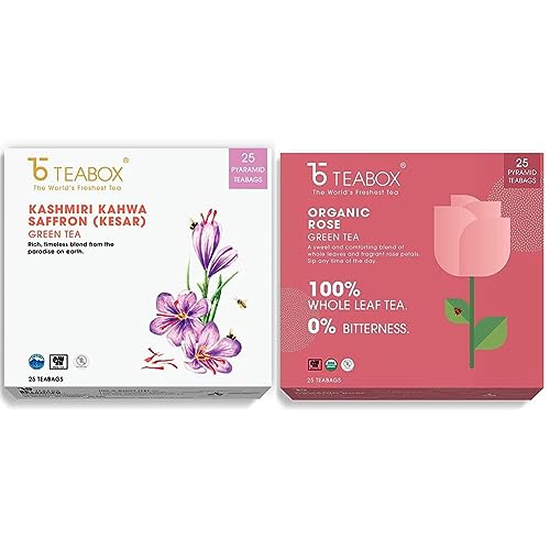 Teabox Fresh Kashmiri Kahwa Saffron (Kesar) Green Tea | Green Tea Handblended with Natural Saffron Almond Cardamom & Cloves | 100% Natural Ingredients 25 TeabagsFlavour: Kashmiri kahwa green tea (teabags) size: 1 box (pack of 16) about the product: experience the world's first natural nitrogen-flushed teabags that seals in the freshness of teas within better than any other. Now you can enjoy the most delicious cup of tea with absolute ease. Our take on a classic brew from the Kashmir valley. Liquor aroma: lifted aroma of saffron and sweet spices liquor taste: the flavors start off savory and woody characteristic of the high-fired green tea. The lento clove note reveals itself next and lingers awhile on the palate. Liquor complements: a refreshing alternative to mimosas at a sunday brunch Teabox: India's modern tea company based out of Darjeeling the heartland of India's tea growing region Teabox is revolutionizing the way India's 200-year old tea industry works. By focusing on preserving the quality and integrity of fine orthodox teas from top tea gardens of India and Nepal Teabox is making sure tea lovers everywhere enjoy the best teas from every harvest at their freshest best. What makes Teabox teas the best. Teabox works directly with over 150 top tea gardens across India and Nepal and procures the freshest teas every harvest season within a week of their production. And with their state-of-the-art dehumidifying and cold storage solutions Teabox is able to keep the freshness aroma and taste of these fine teas intact in the best possible way. Step 1scoop a desired amount of loose tea into a tea maker. Step 2pour over recently heated water and allow the leaves to steep for 2-5 minutes. Step 3once the tea tastes to your liking discard infused leaves and pour a cup. Featured stories about the start-up describe your product in 3 words. Fresh. All-natural. Delicious how did you come up with the idea for this product. My family has been in the tea business for many years and having grown up around Darjeeling I have always had a strong affinity to tea. It was only when I travelled abroad that I realized there is immense global potential to connect tea lovers of the world to better quality produce than the ones they are used to. We started working with a few gardens at first and slowly more and more tea gardens actively became a part of our fresh tea revolution one that now connects top quality teas directly to the consumers. What makes your product special. Ours is the freshest tea there is. And because it's fresh it's the most delicious too. Freshness matters because tea is an agricultural product. So just how you eat a season's freshest produce you should be able to drink the freshest and the most distinctive teas from every harvest season. What has been the best part of your start-up experience. The response from the global tea community has been truly humbling. They are embracing the fresh tea revolution trading consistency' and mass' for high-quality teas that are one-of-a-kind and truly honor the singular virtues of tea gardens of India and Nepal.Teabox Rose Green Tea Bags 25 Pieces | For Glowing Skin | Made with 100% Whole Leaf & Natural Rose PetalsTea plays an important part in our lives as a daily beverage of choice. With growing awareness the appreciation for green tea has increased as a convenient health supplement. Our green teas are made with all-natural ingredients and are all whole leaves that come in pyramid tea bags maximizes the space inside the cup. The pyramid shape allows the ingredients to unfurl and expand. This in turn allows all the flavours to be completely released into your cup. This increases efficiency by enabling the whole leaf to be utilized instead of only the tea particles and the fanning. This rose green tea has a very fragrant character and calms you down instantly. Full of vitamin a and e it helps hydrate and tighten the skin and reduce dark circles. It is also very good for your heart health. Drink it after your long workday to relax you and every day before bed. Now enjoy green teas like never before With high-grade whole leaves that have 5 times more antioxidants than black teas.