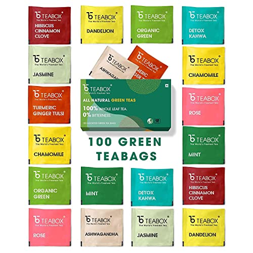 Teabox Green Tea Sampler Bags 100pcs (10pcs X 10 flavors) | 100% Natural I Immunity Boosting Sampler Pack | USDA Certified Organic Green TeaFrom starting your day to sipping it during the afternoon to evening indulgence to bedtime our master blenders have crafted 10 new exciting and beneficial flavors of whole leaf green teas for a healthy lifestyle. We have sourced rare and exotic Indian herbs to make Ashwagandha Chamomile Dandelion Hibiscus Cinnamon Clove Detox Kahwa Mint Jasmine Organic Green Rose & Turmeric Ginger Tulsi organic green teas. A whole gamut of flavored green teas to start your self-care routine now! Made with 100% Whole leaf. 0% bitternessTeabox Detox Kahwa Green Tea 25 Teabags | Made with 8 Natural Ingredients | Helps Cleanse | Immunity Booster | Cold ReliefCOUNT- Includes 25 Teabags and 2 Free Samples. HEALTH BENEFITS- Pure green tea leaves blended with black pepper salt ginger lemon salt tulsi nutmeg and asafoetida to cleanse and detoxify your system. STEEPING GUIDE- Heat 180 ml of water at 80â -85â Place the teabag in a cup and then pour hot water over it. Steep for 3-4 mins. Drink plain or add honey as per taste. Savor a cup of freshness and relax. INGREDIENTS - Green Tea Tulsi Salt Black Pepper Ginger Nutmeg Lemon Salt Asafoetida. THE TEABOX DIFFERENCE - Contains pure all natural ingredients. The unique pyramid design of teabags allows for a better taste and experience. Can be steeped twice. ABOUT TEABOX- Disrupting a 200-year-old industry Teabox connects tea to people directly from the foothills of the Himalayas. We source fresh Indian tea and have served over 5 Billion cups to 121 countries. FROM THE SOURCE- Teabox sources 100% fresh tea directly from over 273 Indian tea gardens in less than 1 week.