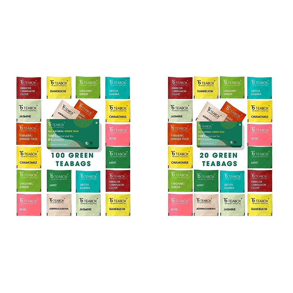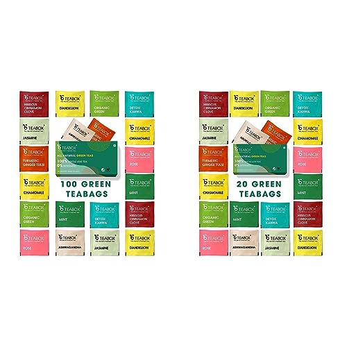Teabox Green Tea Sampler Bags 100pcs (10pcs X 10 flavors) | 100% Natural I Immunity Boosting Sampler Pack | USDA Certified Organic Green TeaFrom starting your day to sipping it during the afternoon to evening indulgence to bedtime our master blenders have crafted 10 new exciting and beneficial flavors of whole leaf green teas for a healthy lifestyle. We have sourced rare and exotic Indian herbs to make Ashwagandha Chamomile Dandelion Hibiscus Cinnamon Clove Detox Kahwa Mint Jasmine Organic Green Rose & Turmeric Ginger Tulsi organic green teas. A whole gamut of flavored green teas to start your self-care routine now! Made with 100% Whole leaf. 0% bitternessTeabox Green Tea Sampler Bags 20pcs (2pcs X 10 flavors) | 100% Natural I Immunity Boosting Sampler Pack | USDA Certified Organic Green TeaTea plays an important part in our lives as a daily beverage of choice. With growing awareness the appreciation for green tea has increased as a convenient health supplement. Our green teas are made with all-natural ingredients and are all whole leaves that ensure the flavour components like tannins and essential oils are retained to the maximum extent. The pyramid shape allows the ingredients to unfurl and expand. This in turn allows all the flavours to be completely released into your cup. With this exotic 10 flavour sampler pack experience a whole gamut of flavoured green teas ranging from the sweet citrusy and memorable notes of honey lemon ginger to the refreshing taste notes of mint green. This variety pack has something for everyone and will leave a mark on your taste buds for sure.