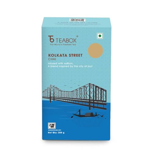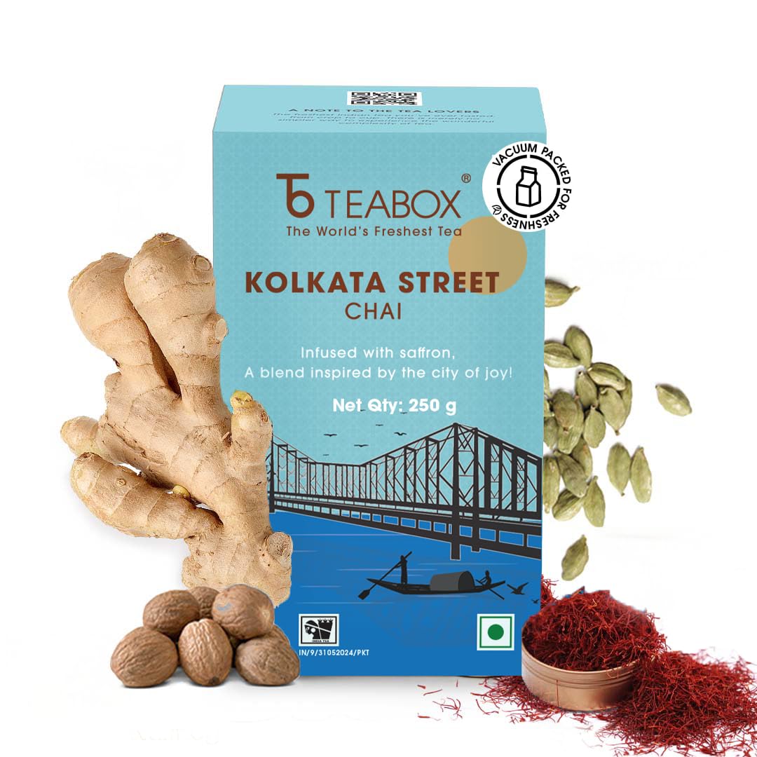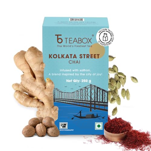 HomeGroceryBeveragesTeaTeabox Kolkata Street Chai | Reminiscent Of The City Of Joy | Rich & Delectable Blended With Saffron Cardamom Nutmeg & Ginger Exquisite Aromas Of Saffron 250 Grams Granules