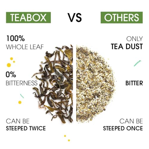 THE TEABOX DIFFERENCE - Our green loose leaf tea contains 100% whole green tea leaves--nothing else. Drinking whole-leaf tea offers a more delicious and sustainable tea experience than lower-quality powdered or dust teas.