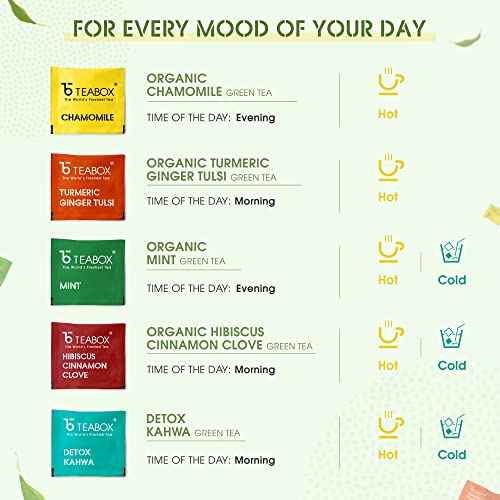 Teabox Organic Darjeeling Green Tea Loose Leaves 100 Grams | For Weight Loss | 0% Calories - Improves Metabolism & Reduces Waist | Made with 100% Whole Leaf Sourced from Highlands of DarjeelingMade for an active lifestyle this green tea is an ideal cup for the ones who are looking for their daily self-care routine. Sourced from organic tea gardens this tea is blended with high-quality green tea and nothing else. Perfect to start your day or sip it between breaks this cup is rich in anti-oxidants helping you stay refreshed the entire day.Teabox Green Tea Sampler Bags 20pcs (2pcs X 10 flavors) | 100% Natural I Immunity Boosting Sampler Pack | USDA Certified Organic Green TeaTea plays an important part in our lives as a daily beverage of choice. With growing awareness the appreciation for green tea has increased as a convenient health supplement. Our green teas are made with all-natural ingredients and are all whole leaves that ensure the flavour components like tannins and essential oils are retained to the maximum extent. The pyramid shape allows the ingredients to unfurl and expand. This in turn allows all the flavours to be completely released into your cup. With this exotic 10 flavour sampler pack experience a whole gamut of flavoured green teas ranging from the sweet citrusy and memorable notes of honey lemon ginger to the refreshing taste notes of mint green. This variety pack has something for everyone and will leave a mark on your taste buds for sure.