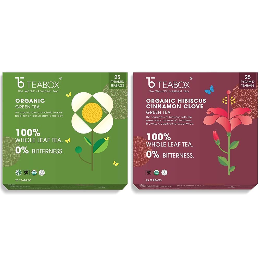 Teabox Organic Darjeeling Green Tea 25 Teabags |100% Whole Leaf Tea Sourced from Darjeeling | Rich in Antioxidants | Healthy and Refreshing | Silken Pyramid TeabagsTea plays an important part in our lives as a daily beverage of choice. With growing awareness the appreciation for green tea has increased as a convenient health supplement. Our green teas are made with all-natural ingredients and are all whole leaves that come in pyramid tea bags maximize the space inside the cup. The pyramid shape allows the ingredients to unfurl and expand. This in turn allows all the flavors to be completely released into your cup. This increases efficiency by enabling the whole leaf to be utilized instead of only the tea particles and the fanning. This Organic Green tea is a refreshing mix of green teas from the hills that is light lively and rich in antioxidants. Apart from aiding weight management this tea also helps you get rid of toxic substances in the body and thereby strengthening the body's immune system. Now enjoy green teas like never before with high-grade whole leaves that have 5 times more antioxidants than black teas.Teabox Organic Hibiscus Cinnamon Clove Green Tea Bags 25 pcs | 100% Natural Hibiscus Cinnamon & CloveCOUNT- Includes 25 Teabags and 2 Free Samples. HEALTH BENEFITS - Pure high-grade long leaf green tea leaves blended with natural Hibiscus cinnamon and clove for a refreshing experience. MAKES FOR A VERY GOOD ICED TEA. STEEPING GUIDE- Heat 180 ml of water at 80â -85â Place the teabag in a cup and then pour hot water over it. Steep for 3-4 mins. Drink plain or add honey as per taste. Savor a cup of freshness and relax. INGREDIENTS - Green Tea Hibiscus Cinnamon Clove. THE TEABOX DIFFERENCE - Contains pure high-grade tea leaves with more anti-oxidants & bioactive. The unique pyramid design of teabags allows better unfurling of leaves for a better taste and experience. Can be steeped twice. ABOUT TEABOX- Disrupting a 200-year-old industry Teabox connects tea to people directly from the foothills of the Himalayas. We source fresh Indian tea and have served over 5 Billion cups to 121 countries. FROM THE SOURCE- Teabox sources 100% fresh tea directly from over 273 Indian tea gardens in less than 1 week.
