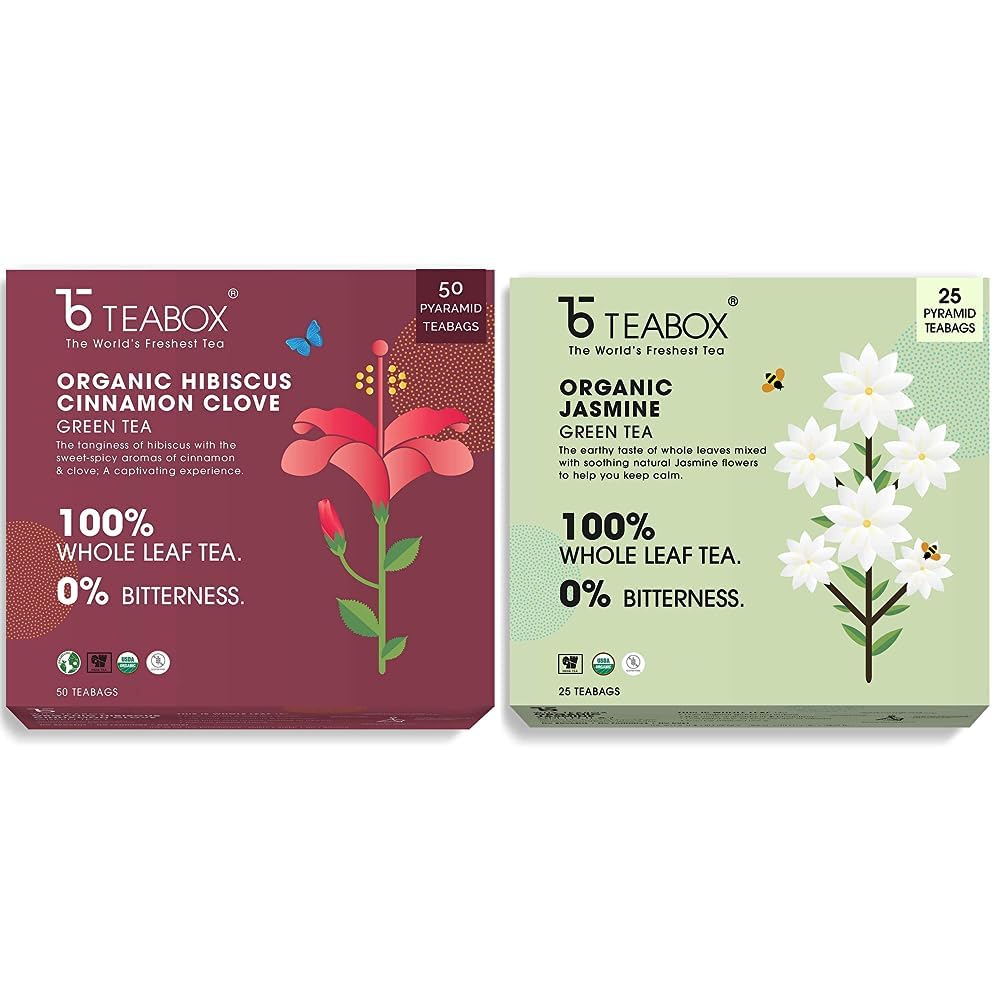 Teabox Organic Hibiscus Cinnamon Clove Green Tea Bags 50 pcs | Immune System Booster and Weight Management | Natural Hibiscus Cinnamon & CloveTeabox Organic Hibiscus Cinnamon Clove Green Tea is a refreshing blend of green tea hibiscus cinnamon and clove offering a unique taste and aroma. This tea is carefully curated with Organic 100% Natural ingredients to provide a healthy and flavorful tea experience. It is rich in antioxidants and can help to promote digestion reduce inflammation and improve heart health. Enjoy this delicious tea hot or cold and experience its rejuvenating properties. Teabox's Organic Hibiscus Cinnamon Clove Green Tea comes in a premium quality pack that ensures maximum freshness making it an ideal gift for tea lovers or a perfect treat for yourself.Teabox Organic Jasmine Green Tea 25 Teabags | Sourced From Madurai | For Calm Mind and Relaxation | Made with 100% Whole Leaf Natural Jasmine Flowers & Natural FlavorsCOUNT- Includes 25 Teabags and 2 Free Samples. HEALTH BENEFITS - Pure high-grade long leaf green tea leaves blended with natural Jasmine flowers to soothe the senses. STEEPING GUIDE- Heat 180 ml of water at 80â-85â Place the teabag in a cup and then pour hot water over it. Steep for 3-4 mins. Drink plain or add honey as per taste. Savor a cup of freshness and relax. INGREDIENTS - Green Tea Jasmine Flowers Natural Jasmine flavor. THE TEABOX DIFFERENCE - Contains pure high-grade tea leaves with more anti-oxidants & bioactive. The unique pyramid design of teabags allows better unfurling of leaves for a better taste and experience. Can be steeped twice. ABOUT TEABOX- Disrupting a 200-year-old industry Teabox connects tea to people directly from the foothills of the Himalayas. We source fresh Indian tea and have served over 5 Billion cups to 121 countries. FROM THE SOURCE- Teabox sources 100% fresh tea directly from over 273 Indian tea gardens in less than 1 week.
