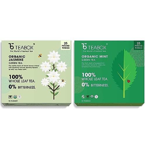 Teabox Organic Jasmine Green Tea 25 Teabags | Sourced From Madurai | For Calm Mind and Relaxation | Made with 100% Whole Leaf Natural Jasmine Flowers & Natural FlavorsCOUNT- Includes 25 Teabags and 2 Free Samples. HEALTH BENEFITS - Pure high-grade long leaf green tea leaves blended with natural Jasmine flowers to soothe the senses. STEEPING GUIDE- Heat 180 ml of water at 80â-85â Place the teabag in a cup and then pour hot water over it. Steep for 3-4 mins. Drink plain or add honey as per taste. Savor a cup of freshness and relax. INGREDIENTS - Green Tea Jasmine Flowers Natural Jasmine flavor. THE TEABOX DIFFERENCE - Contains pure high-grade tea leaves with more anti-oxidants & bioactive. The unique pyramid design of teabags allows better unfurling of leaves for a better taste and experience. Can be steeped twice. ABOUT TEABOX- Disrupting a 200-year-old industry Teabox connects tea to people directly from the foothills of the Himalayas. We source fresh Indian tea and have served over 5 Billion cups to 121 countries. FROM THE SOURCE- Teabox sources 100% fresh tea directly from over 273 Indian tea gardens in less than 1 week.Teabox Organic Green Mint Tea 25 Teabags | Exotic Blend of Premium Green Tea and Real Peppermint Leaves | Boosts Immunity and Improves Digestion | Silken Pyramid TeabagsThis Mint Green tea is a good immunity booster and relieves bloating cramps and stomach discomforts. This tea contains a fresh dash of peppermint along with the trademark earthy notes of green tea that leaves you feeling fresh while its rich antioxidants aid in weight management.Now enjoy green teas like never before with high grade whole leaves that have 5 times more antioxidants than black teas.