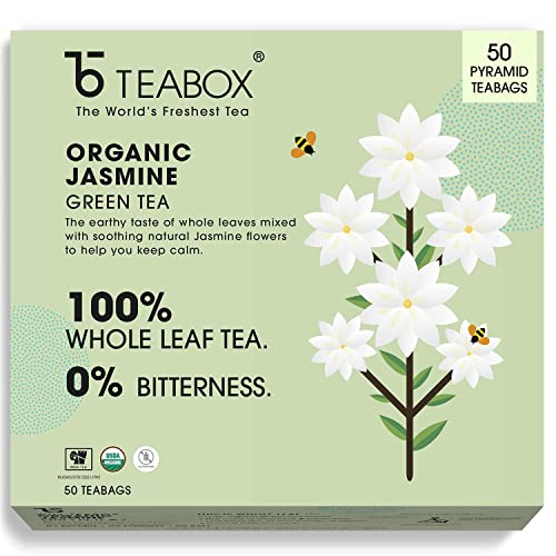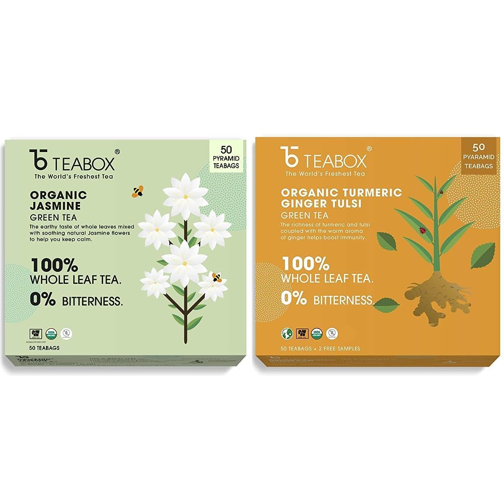 Teabox Organic Jasmine Green Tea 50 Teabags | Sourced From Madurai | For Calm Mind and Relaxation | Made with 100% Whole Leaf Natural Jasmine Flowers & Natural FlavorsThis Jasmine Green tea is well known for its subtly fragrant notes that leave you wanting more. In addition to aiding with weight management this tea is known to have stress relieving and relaxing properties. The sweetness of jasmine is prominent in this tea with its soothing aroma. The earthy and vegetal notes of the green tea is balanced and complemented by the sublime mellow floral notes of jasmine.Now enjoy green teas like never before with high grade whole leaves that have 5 times more antioxidants than black teas.Teabox Organic Turmeric Ginger Tulsi Green Tea 50 Teabags | For Immunity Boosting Digestion and Sore Throat | 100% Whole Leaf Tea 0% Bitterness | Silken Pyramid TeabagsTea plays an important part in our lives as a daily beverage of choice. With growing awareness the appreciation for green tea has increased as a convenient health supplement. Our green teas are made with all-natural ingredients and are all whole leaves that come in pyramid tea bags maximize the space inside the cup. The pyramid shape allows the ingredients to unfurl and expand. This in turn allows all the flavors to be completely released into your cup. This increases efficiency by enabling the whole leaf to be utilized instead of only the tea particles and the fanning. This Turmeric Ginger Tulsi Green tea is filled with the mild aroma of turmeric and the biting sweet warmth of ginger. The mix of these two spices is special and gives the cup a certain heat and zest with a mild woody flavor. It boosts the immune system and strengthens you with every sip. Now enjoy green teas like never before with high-grade whole leaves that have 5 times more antioxidants than black teas.
