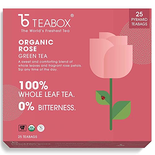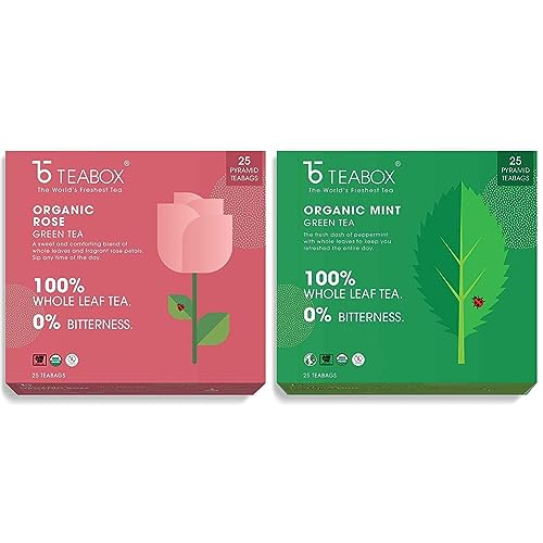 Teabox Rose Green Tea Bags 25 Pieces | For Glowing Skin | Made with 100% Whole Leaf & Natural Rose PetalsTea plays an important part in our lives as a daily beverage of choice. With growing awareness the appreciation for green tea has increased as a convenient health supplement. Our green teas are made with all-natural ingredients and are all whole leaves that come in pyramid tea bags maximizes the space inside the cup. The pyramid shape allows the ingredients to unfurl and expand. This in turn allows all the flavours to be completely released into your cup. This increases efficiency by enabling the whole leaf to be utilized instead of only the tea particles and the fanning. This rose green tea has a very fragrant character and calms you down instantly. Full of vitamin a and e it helps hydrate and tighten the skin and reduce dark circles. It is also very good for your heart health. Drink it after your long workday to relax you and every day before bed. Now enjoy green teas like never before With high-grade whole leaves that have 5 times more antioxidants than black teas.Teabox Organic Green Mint Tea 25 Teabags | Exotic Blend of Premium Green Tea and Real Peppermint Leaves | Boosts Immunity and Improves Digestion | Silken Pyramid TeabagsThis Mint Green tea is a good immunity booster and relieves bloating cramps and stomach discomforts. This tea contains a fresh dash of peppermint along with the trademark earthy notes of green tea that leaves you feeling fresh while its rich antioxidants aid in weight management.Now enjoy green teas like never before with high grade whole leaves that have 5 times more antioxidants than black teas.