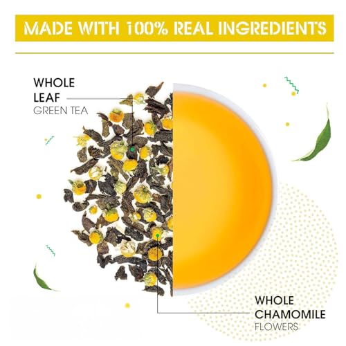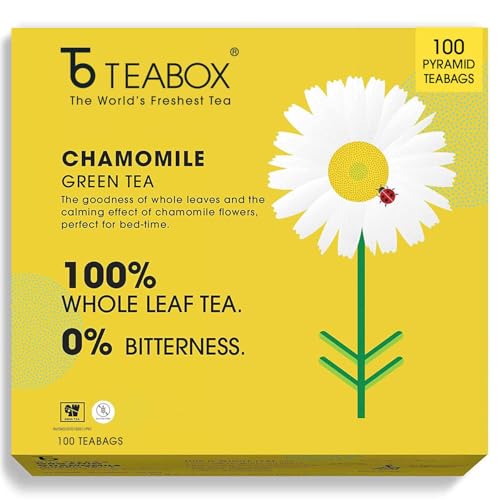 Teabox Premium Organic Green Tea With Chamomile Flowers | 100% Whole Leaf Green Tea Leaves With Whole Chamomile Flower | 0% Bitterness | USDA ORGANIC | 100 Tea Bags (Low Caffeine)