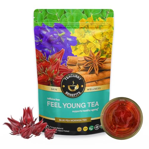 100% Natural Ingredients - Teacurry Anti Ageing Tea or Feel Young Tea is a unique blend of pure butterfly blue pea flowers of the Clitoria Ternatea plant sourced from the Andaman Indian Moringa in form of Moringa Oleifera is sourced from farmlands in Kera