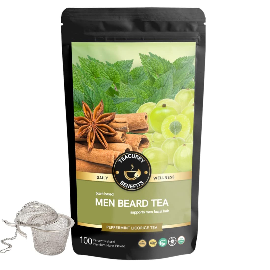 • 100% Natural Beard Tea Teacurry Beard Tea contains Fenugreek Brahmi Amalaki Neem Nettle Rosemary Licorice Curry Leaves and Peppermint. This blend is perfect for growing beard and get from itchy beard and patchy beards. This tea works for all beard and mo