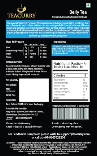 100% Natural Ingredients - Teacurry belly tea consists of a powerful Ayurvedic tea blend of Peppermint from Hariyana Coriander from various gardens spread across Assam Black Pepper Cassia cinnamon from Meghalaya mighty ginger from Orissa Dandelion Foenum