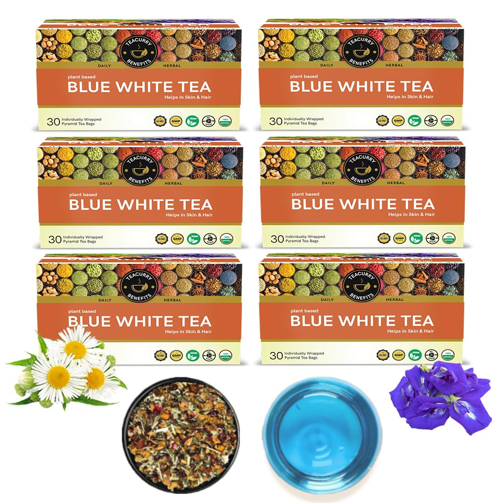 Teacurry Blue White Tea (180 Tea Bags) - Helps with Skin Wellness Hair Strength Calmness and Sleep | Flower Based Caffeine Free Herbal Tea