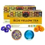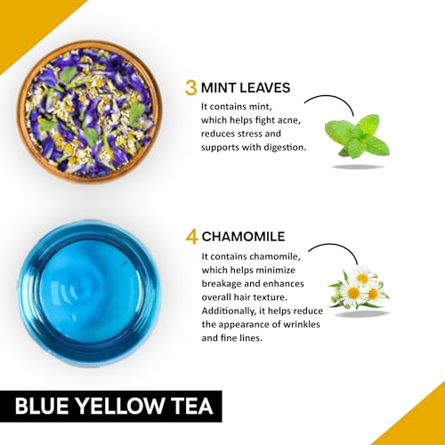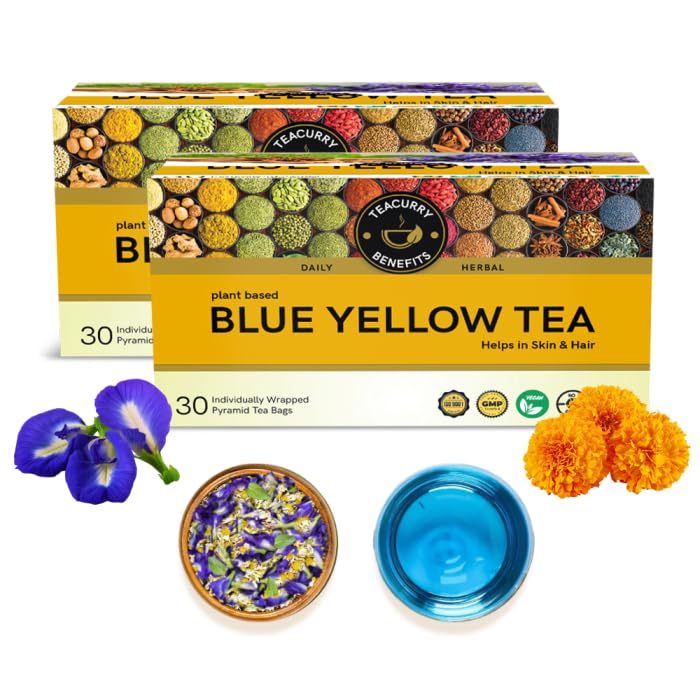 Teacurry Blue Yellow Tea Blend is a calming herbal infusion made from marigold blue pea flower mint leaves and chamomile. It offers a soothing experience with floral flavors vibrant colors and wellness benefits. The marigold adds sweetness blue pea flower provides a striking hue mint offers refreshment and chamomile promotes relaxation.