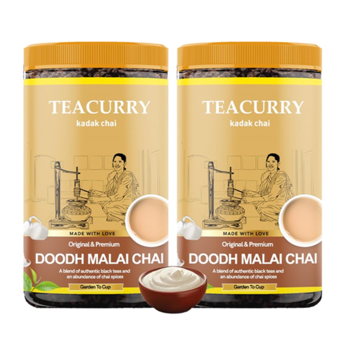 Teacurry Doodh Malai Chai is a popular tea beverage from the Indian subcontinent. The name roughly translates to milk cream tea in English. It is a creamy and indulgent drink. The flavours of Teacurry Doodh Malai Chai exactly match the traditional version which is made by simmering tea leaves milk and spices like cardamom ginger and in a pot. Traditionally the mixture is then strained and served hot with a dollop of whipped cream or malai (a type of clotted cream) on top. Teacurry Doodh Malai Chai exactly gives this taste and the ition of malai flavour gives the tea a rich velvety texture and a delightfully creamy flavour. Doodh Malai Chai is typically enjoyed as a comforting and indulgent drink particularly during winter months. It is commonly served as a breakfast or evening beverage often paired with a savoury snack like biscuits or bread. Some people like to sugar or honey to enhance the sweetness of the drink while others prefer it without any itional sweetener.