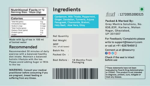 100% Natural Ingredients - Teacurry Fatty Liver Tea consists of Ginger Dandelion Turmeric Cardamom Milk Thistle Peppermint Fenugreek Chamomile Brahmi Holy Basil Aloe Vera Giloy and Arjuna. All these provide the perfect blend for liver purification. The te