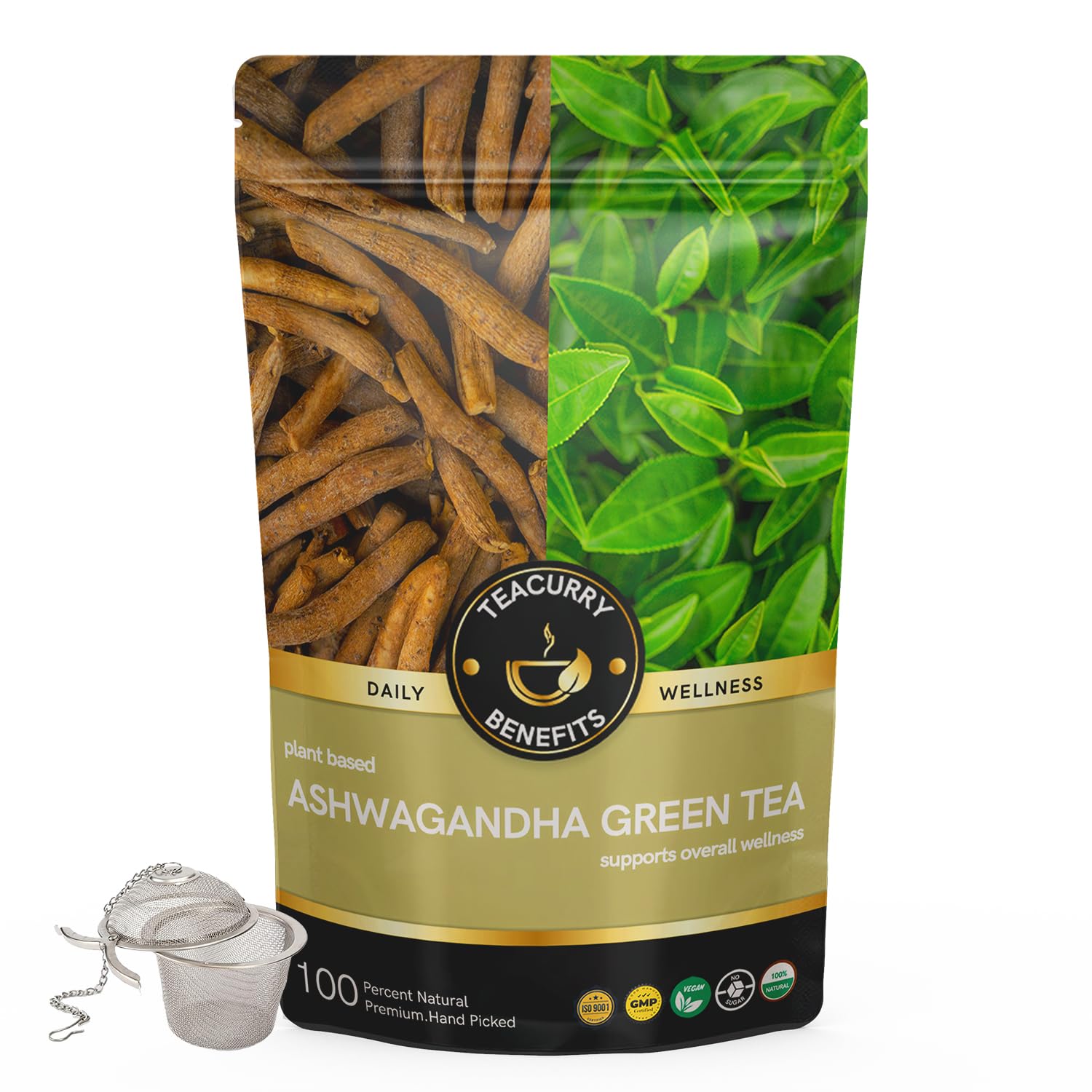 TEACURRY Ashwagandha Green Tea - 100 Gms Loose Tea / 50 Cups + Infuser | Ashwagandha Green Tea Helps with Weight Management, Cholesterol | Herbal Tea for Sugar Control