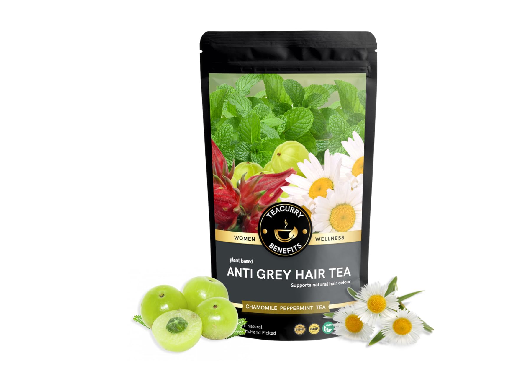 Introducing Teacurry's Grey Hair Tea a natural and organic way to minimize grey hair. Our special blend of premium ingredients helps to nourish your scalp and minimize greying while evening out your hair color. With regular use you can start seeing results in just two or three months! Our tea contains Ayurvedic herbs such as Jasmine seeds curry leaves Turmeric chamomile & Amla that nourishes the scalp from deep. Teacurry Grey Hair Tea is a carefully crafted blend of herbs and botanicrenowned for their hair-nourishing properties. Each ingredient is chosen for its specific benefits working mutually to slow down the greying process and promote the growth of naturally dark hair.