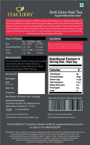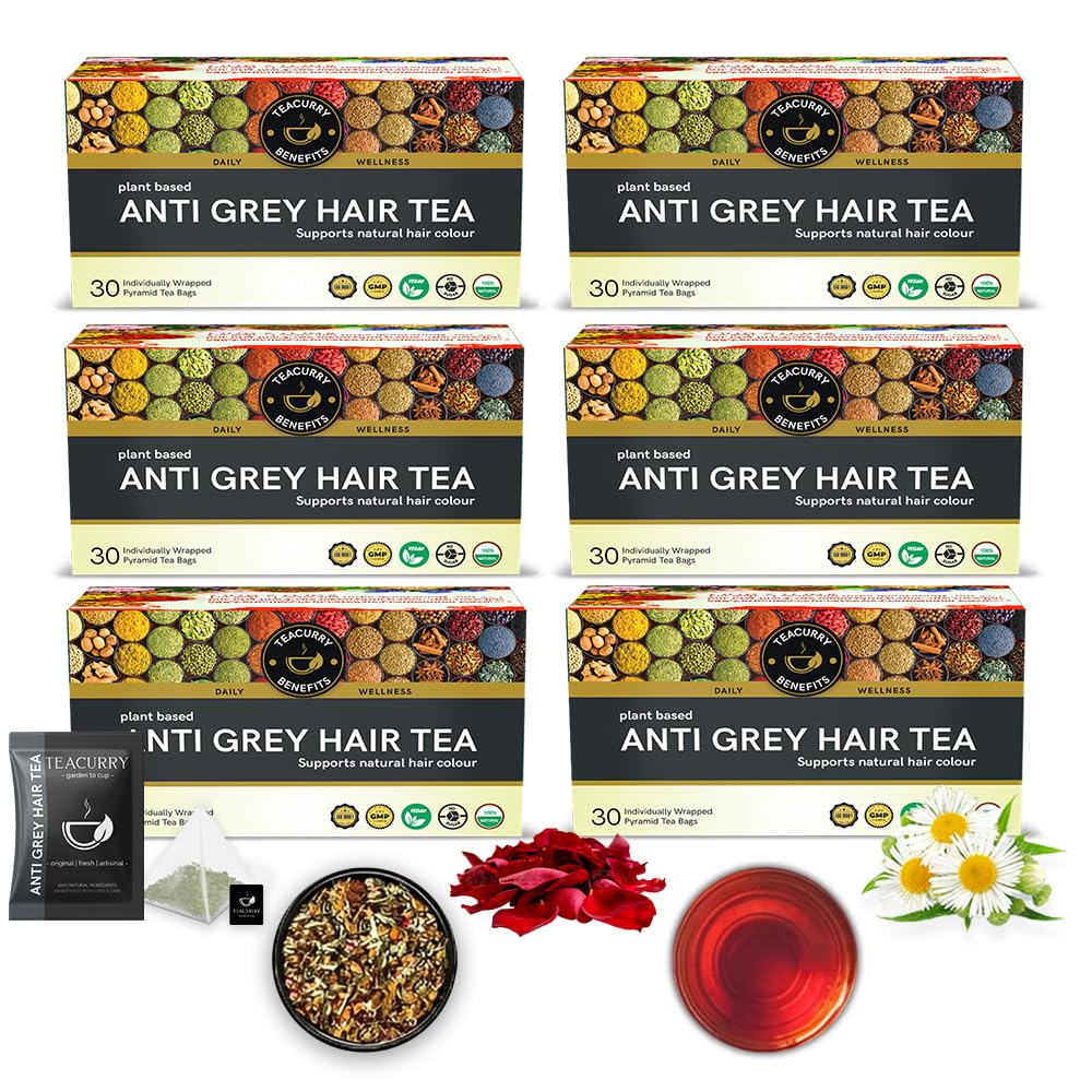 Teacurry Grey Hair Tea - (6 Month Pack 180 Tea Bags) Helps to regain natural hair color Boost melanin production & Lower the hair fall | 100% Natural
