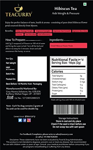 • 100% Natural Hibiscus Tea Teacurry hibiscus petals tea consists of pure hibiscus flowers in form of hibiscus roselle variety from farmlands in Mysore. Handpicked and selected by our highly skilled master tasters over thousands of cups Teacurry Hibiscus te