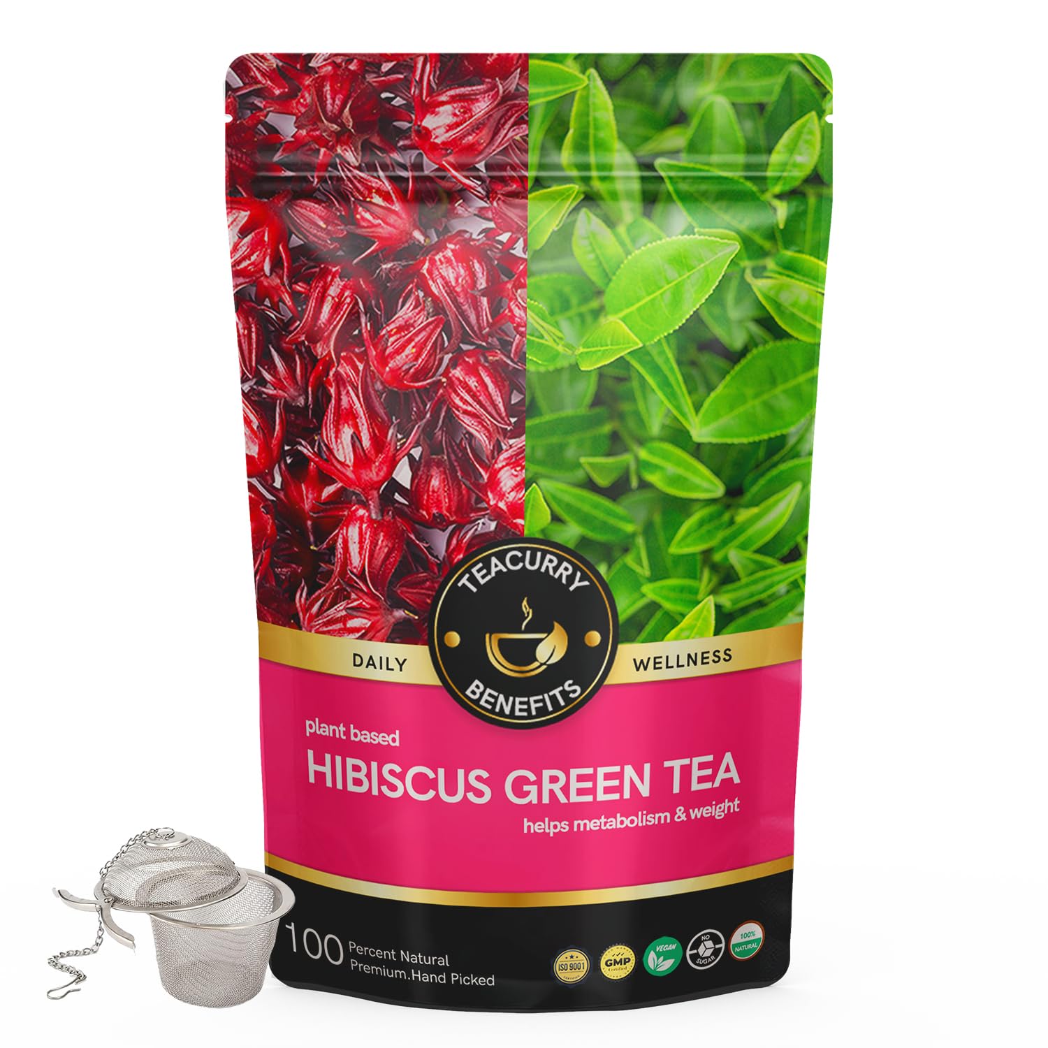 TEACURRY Hibiscus Green Tea - 100 Gram Loose + Infuser | Helps with Weight Loss Management, Increase Metabolism | Hibiscus Leaf Tea | 100% Natural