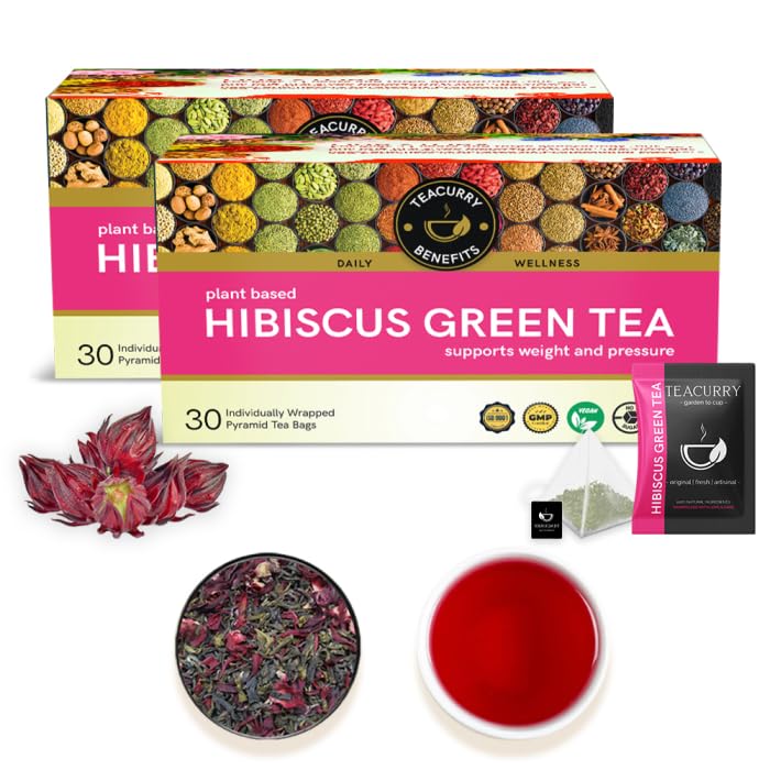 TEACURRY Hibiscus Green Tea - 60 Pyramid Hibiscus Green Tea Bags | Hibiscus Green Tea Bags Helps lower blood pressure, promotes weight loss & boosts liver health | Tea for weight loss