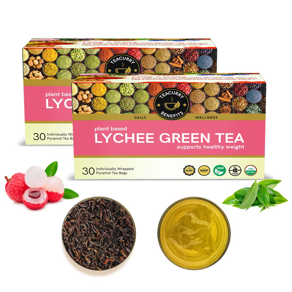 TEACURRY Lychee Flavor Green Tea (2 Month Pack, 60 Tea Bags) - Organic Lychee Green Tea | Rich In Vitamins & Minerals | Made With Natural Ingredients