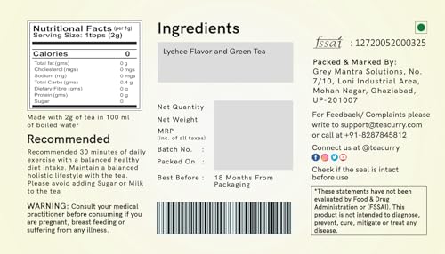 Teacurry Lychee Green Tea is a wonderful mix of green tea leaves and lychee fruit known for its sweet and flowery taste. Green tea is famous for its health perks and with lychee it becomes a tasty and refreshing drink. Some research indicates that green tea may help weight management.