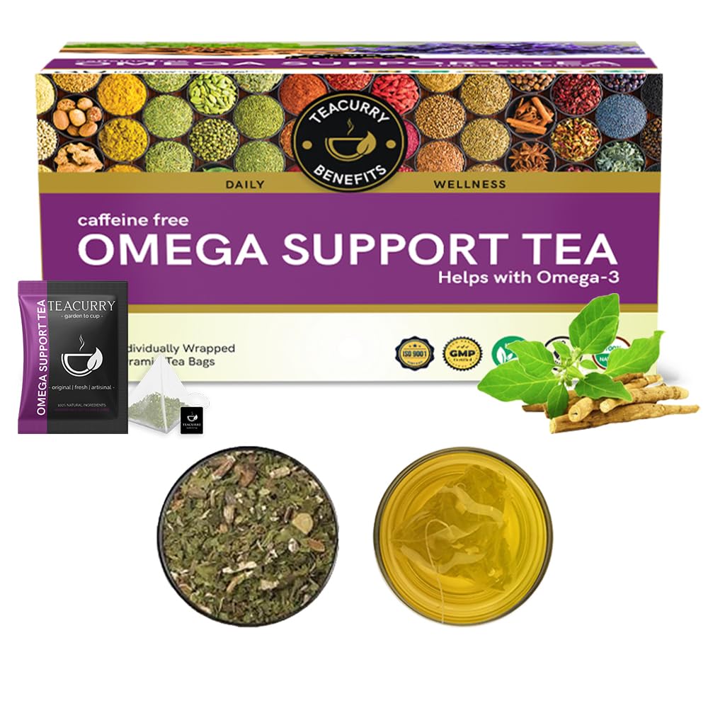 Teacurry Omega Support Tea is a powerful blend of natural herbs and plant-based ingredients. Rich in omega 3 it is designed to support overall wellness including wellness for the eyes brain hair and joints. It is crafted from a unique blend of natural ingredients including Peppermint Fennel Ginger Chia Seeds Flax Seeds Coriander Turmeric Cumin Seeds Oregano Ashwagandha Gotu Kola Lemon Balm Cardamom.